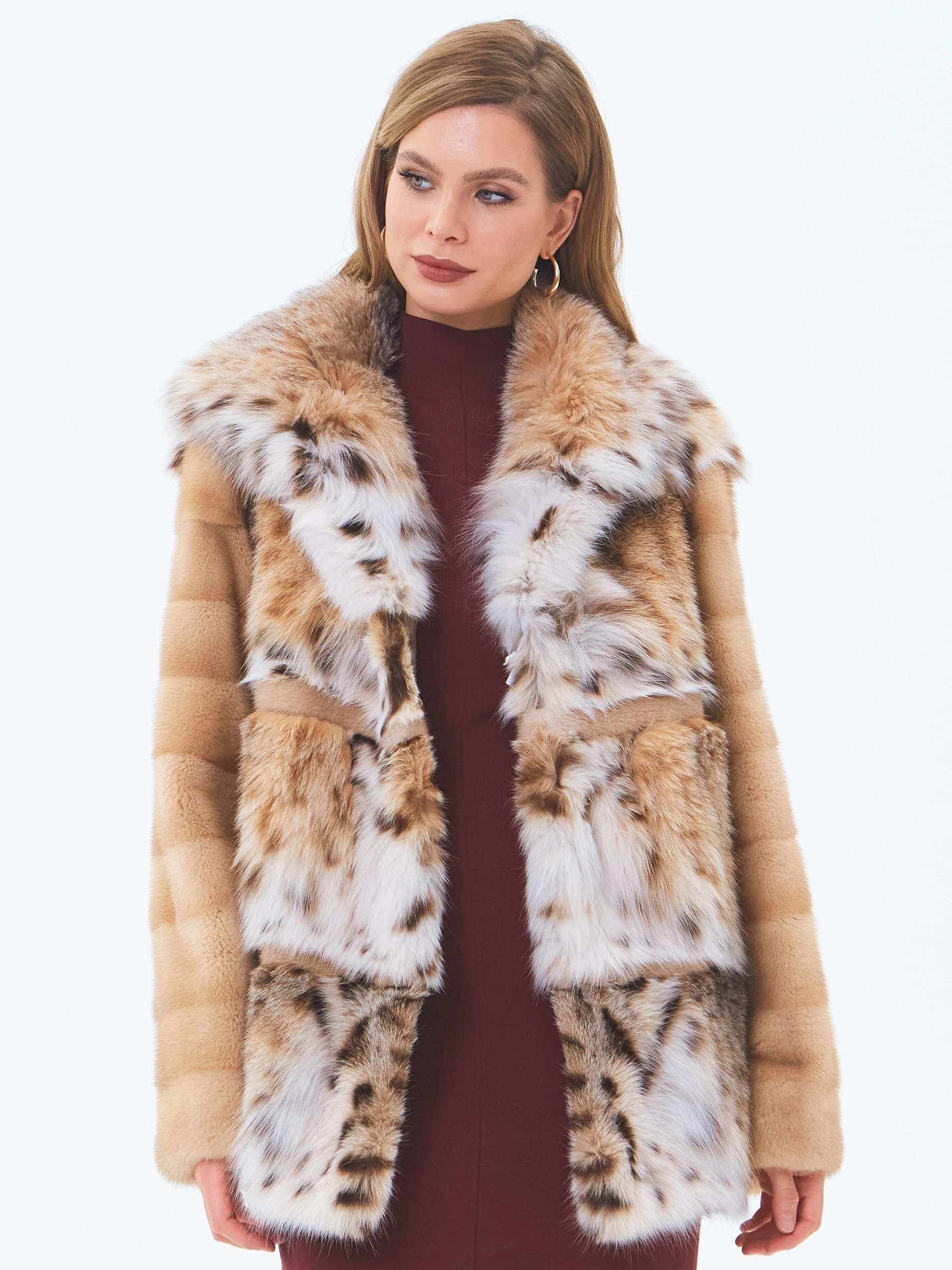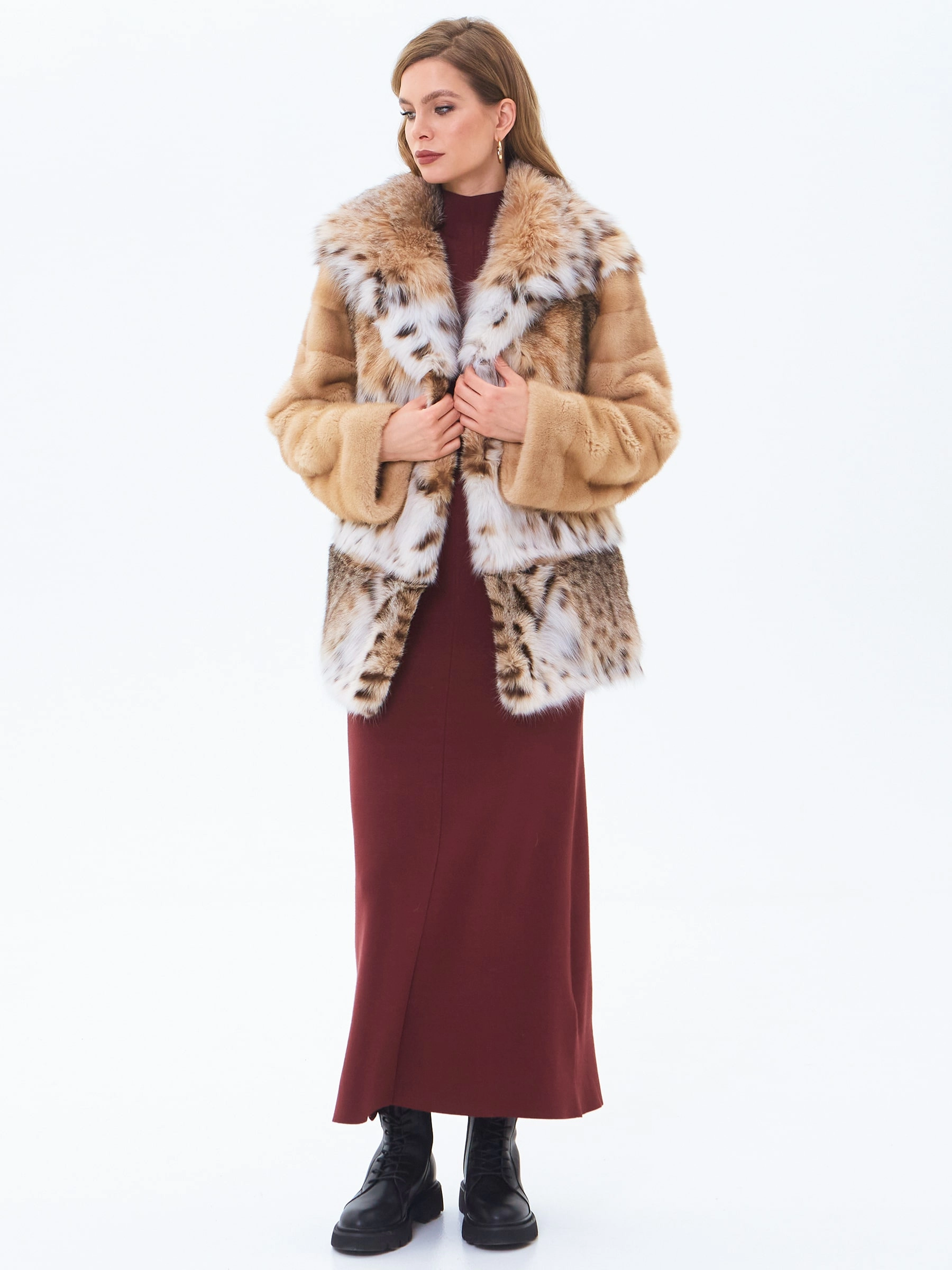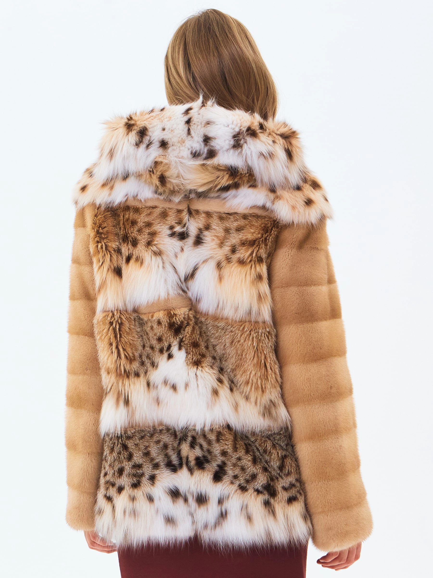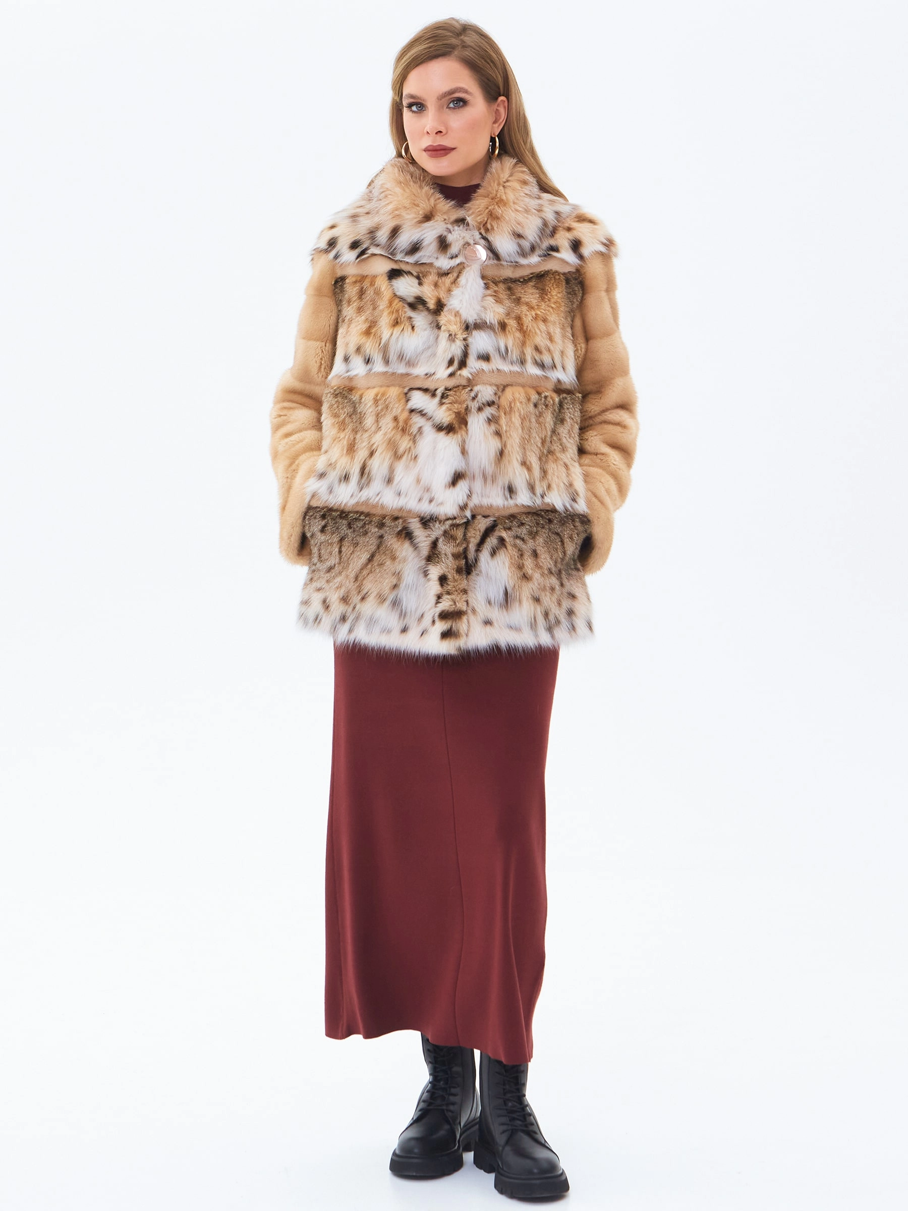 Женская шуба из рысевидной кошки с капюшоном премиум-класса нежного бежевого цвета, воплощение эксклюзивной роскоши и безупречного вкуса для холодной зимы. Короткую модель длиной 70 см выполнили из нежного меха норки в комбинации с мехом рысевидной кошки, который дарит выразительную пятнистую фактуру и благородный объем, а прямой классический крой с втачным рукавом обеспечивает идеальную посадку по фигуре. Глубокий объемный капюшон защищает от ветра и позволяет обойтись без головного убора, два врезных боковых кармана добавляют практичности, а удобная застежка на металлические клипсы и подкладка из смесовой ткани гарантируют комфорт. Совет стилиста: комбинация мехов делает эту шубу главным акцентом образа - носите ее с лаконичной базой в бежевых, молочных или серых тонах, позволяя уникальной фактуре быть главным героем.