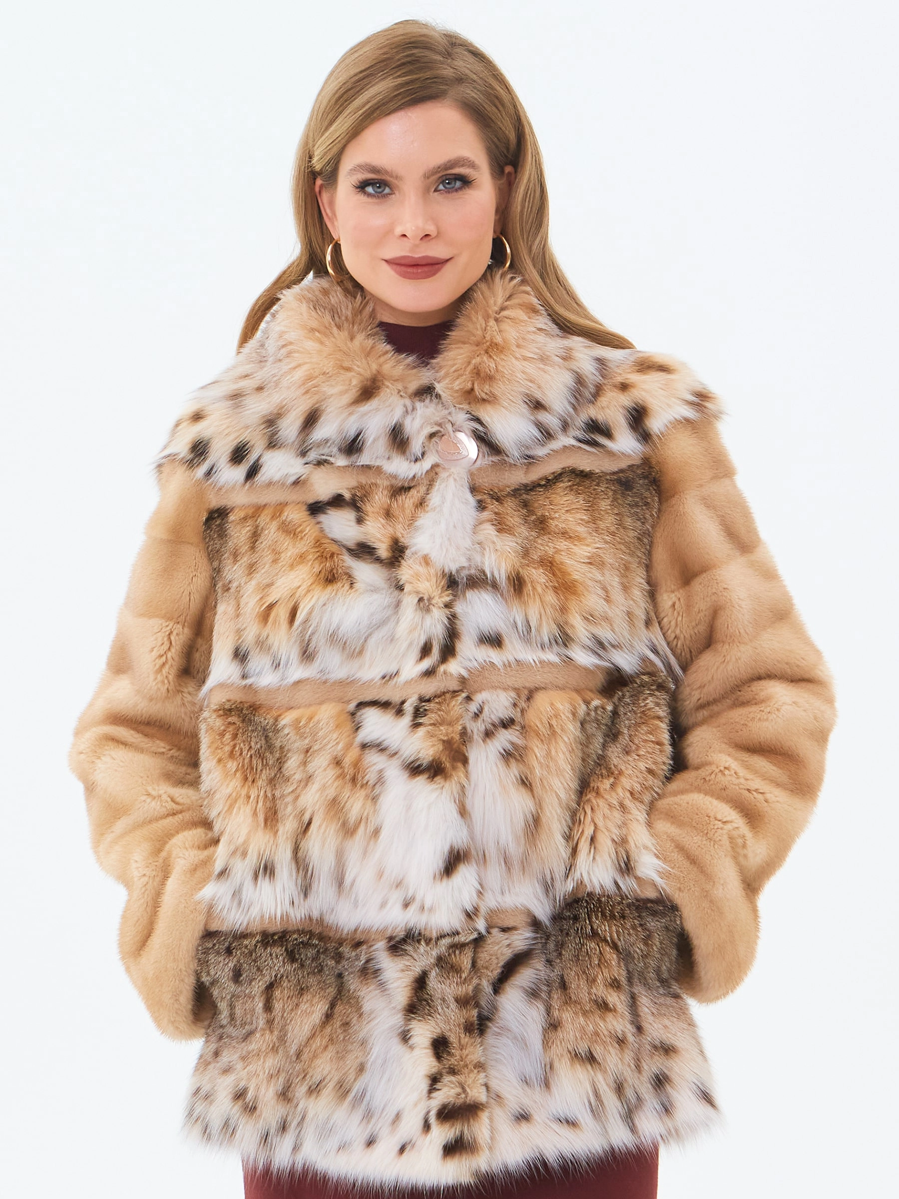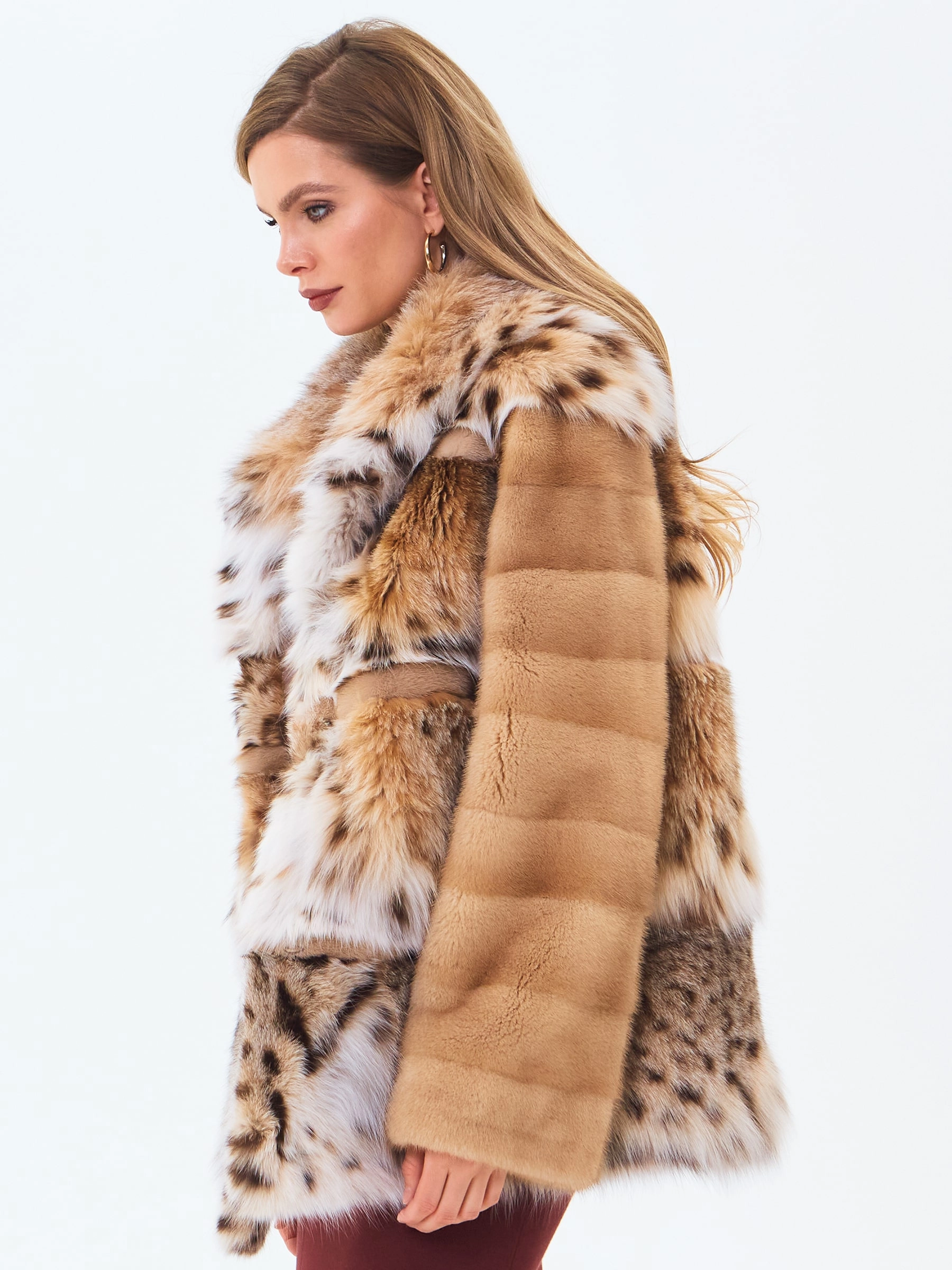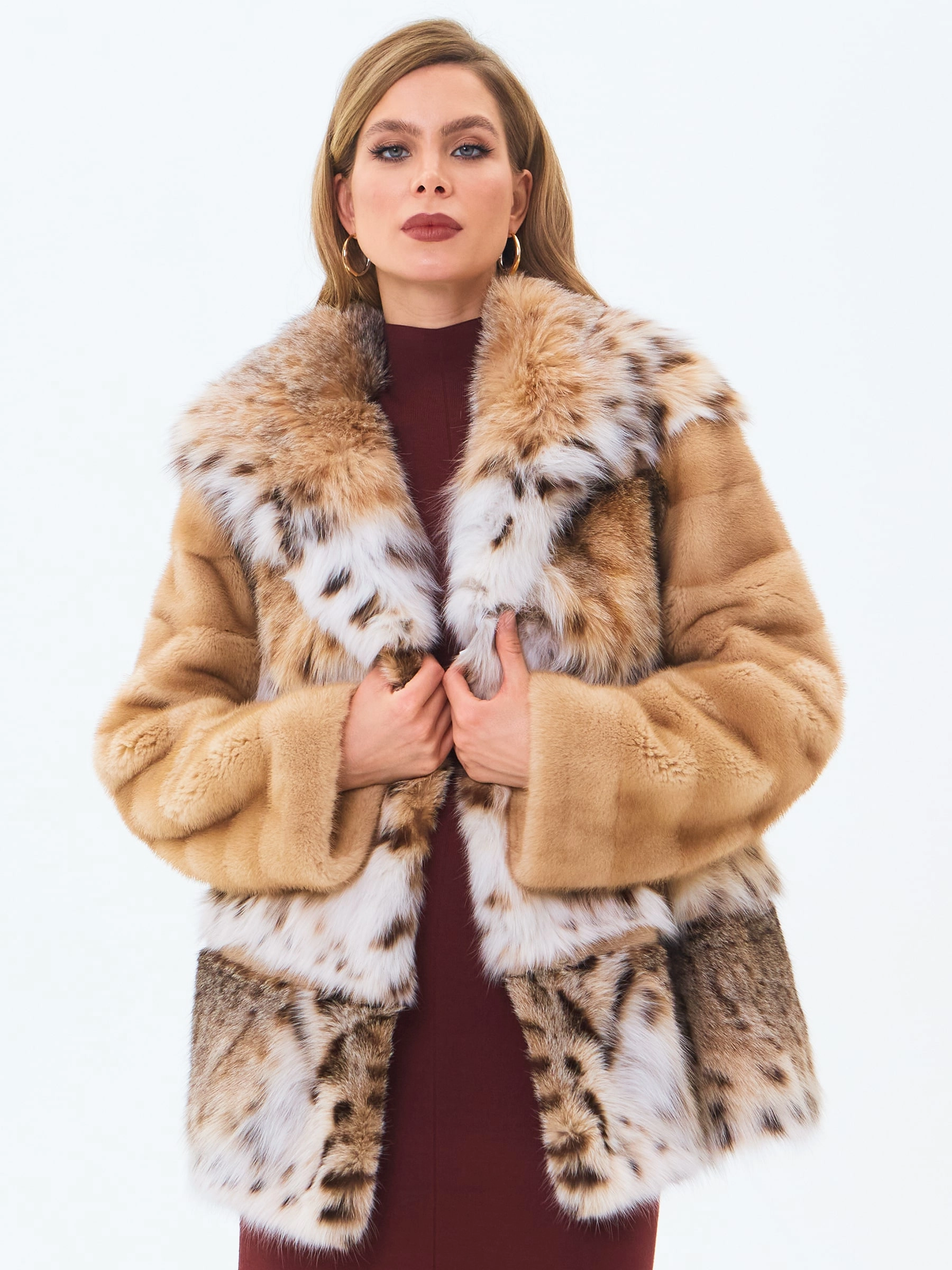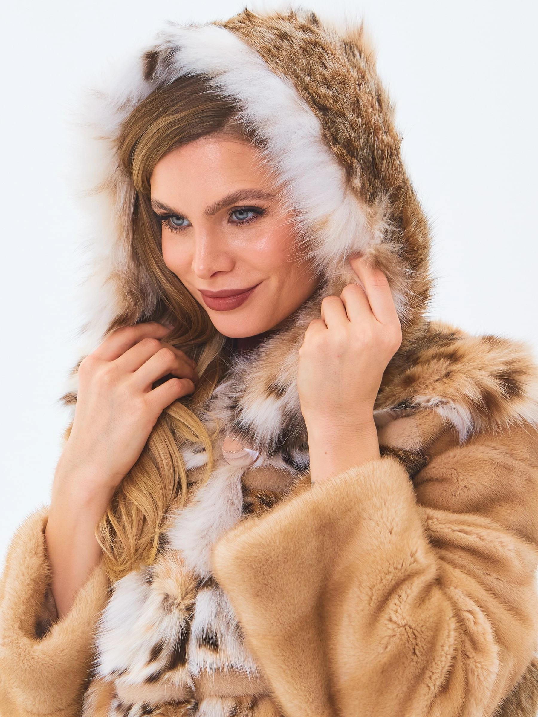 Женская шуба из рысевидной кошки с капюшоном премиум-класса нежного бежевого цвета, воплощение эксклюзивной роскоши и безупречного вкуса для холодной зимы. Короткую модель длиной 70 см выполнили из нежного меха норки в комбинации с мехом рысевидной кошки, который дарит выразительную пятнистую фактуру и благородный объем, а прямой классический крой с втачным рукавом обеспечивает идеальную посадку по фигуре. Глубокий объемный капюшон защищает от ветра и позволяет обойтись без головного убора, два врезных боковых кармана добавляют практичности, а удобная застежка на металлические клипсы и подкладка из смесовой ткани гарантируют комфорт. Совет стилиста: комбинация мехов делает эту шубу главным акцентом образа - носите ее с лаконичной базой в бежевых, молочных или серых тонах, позволяя уникальной фактуре быть главным героем.