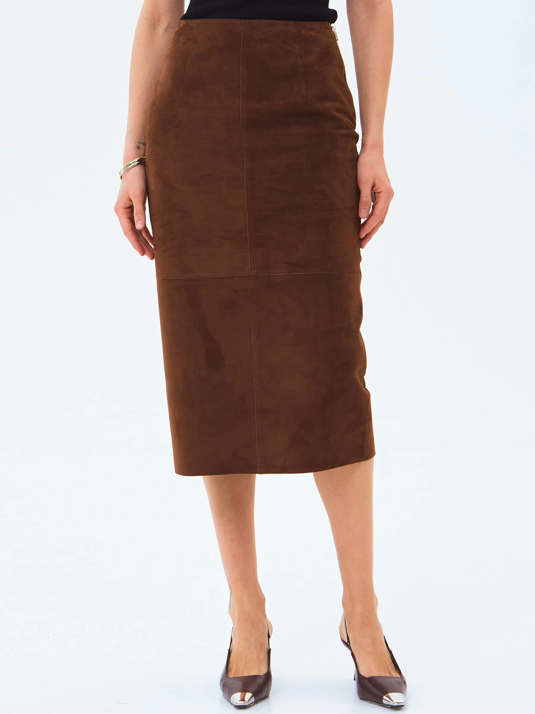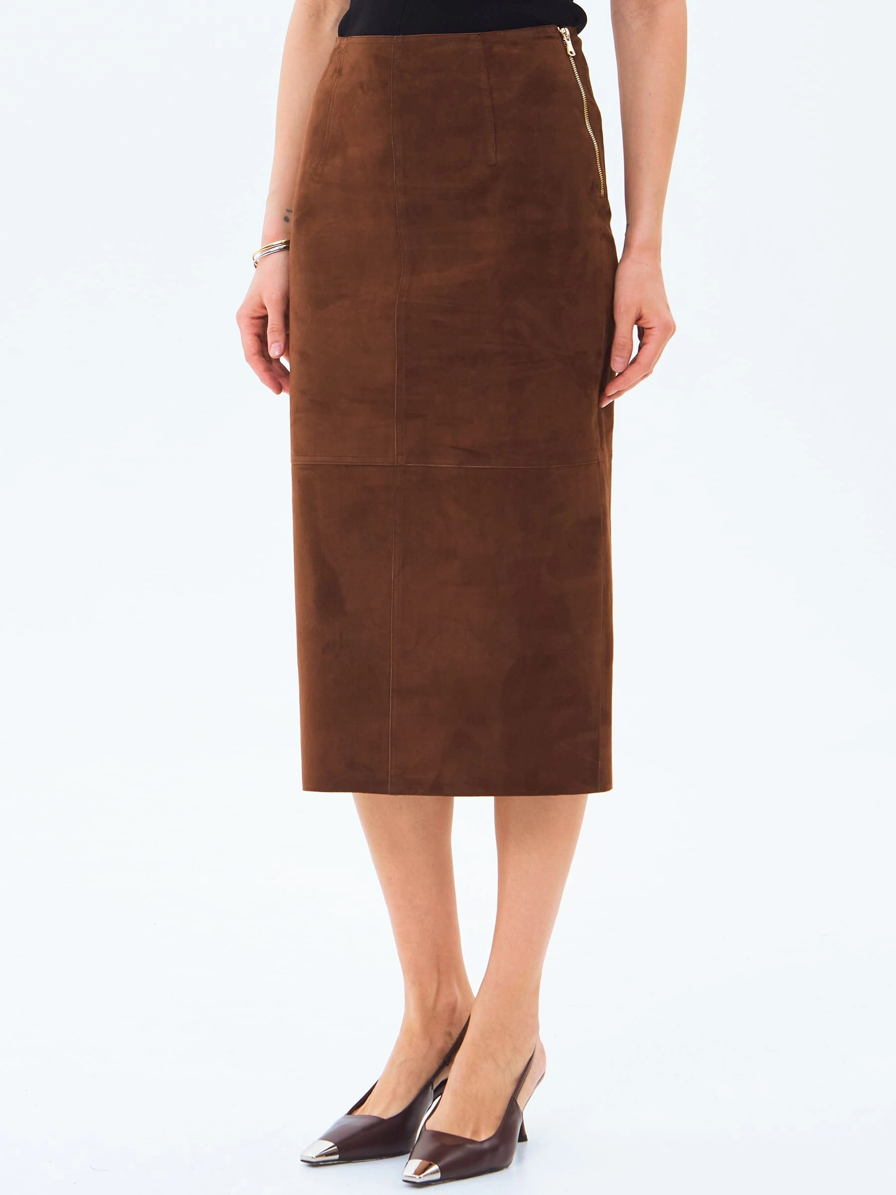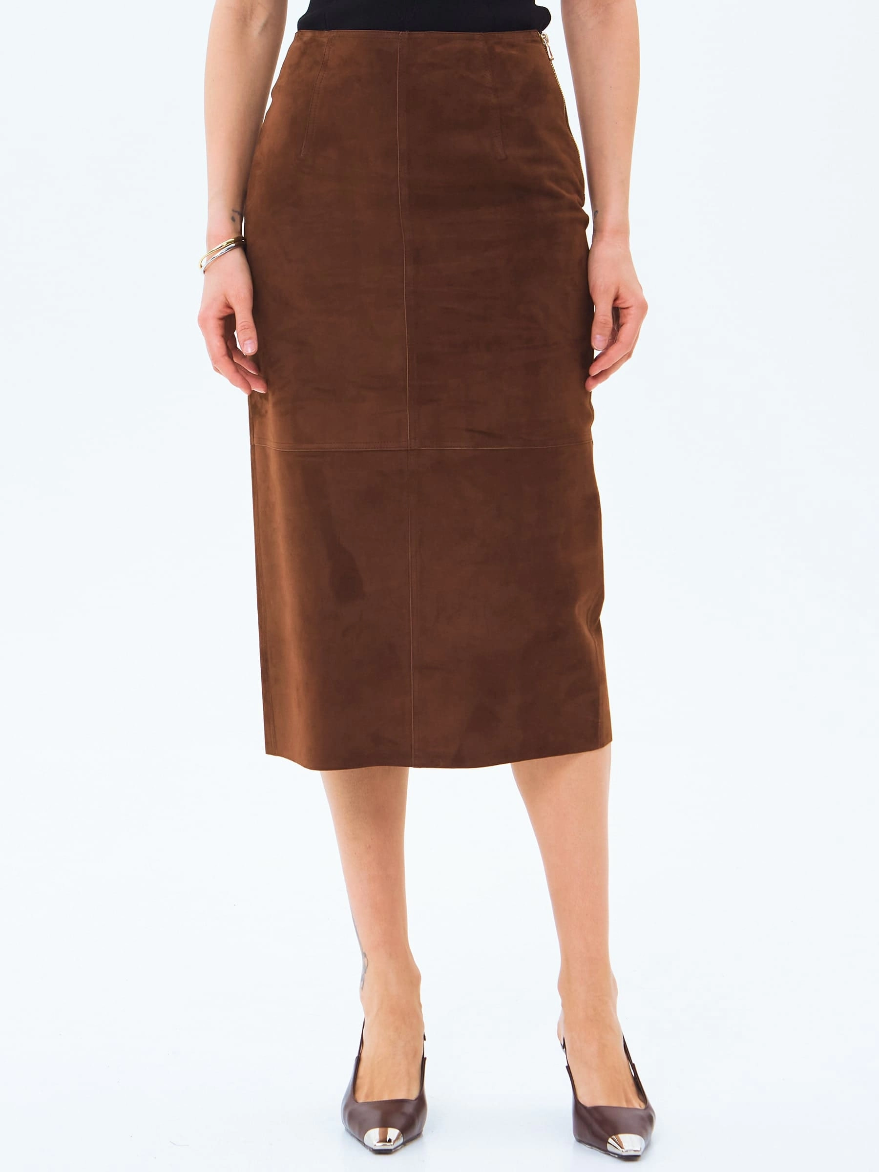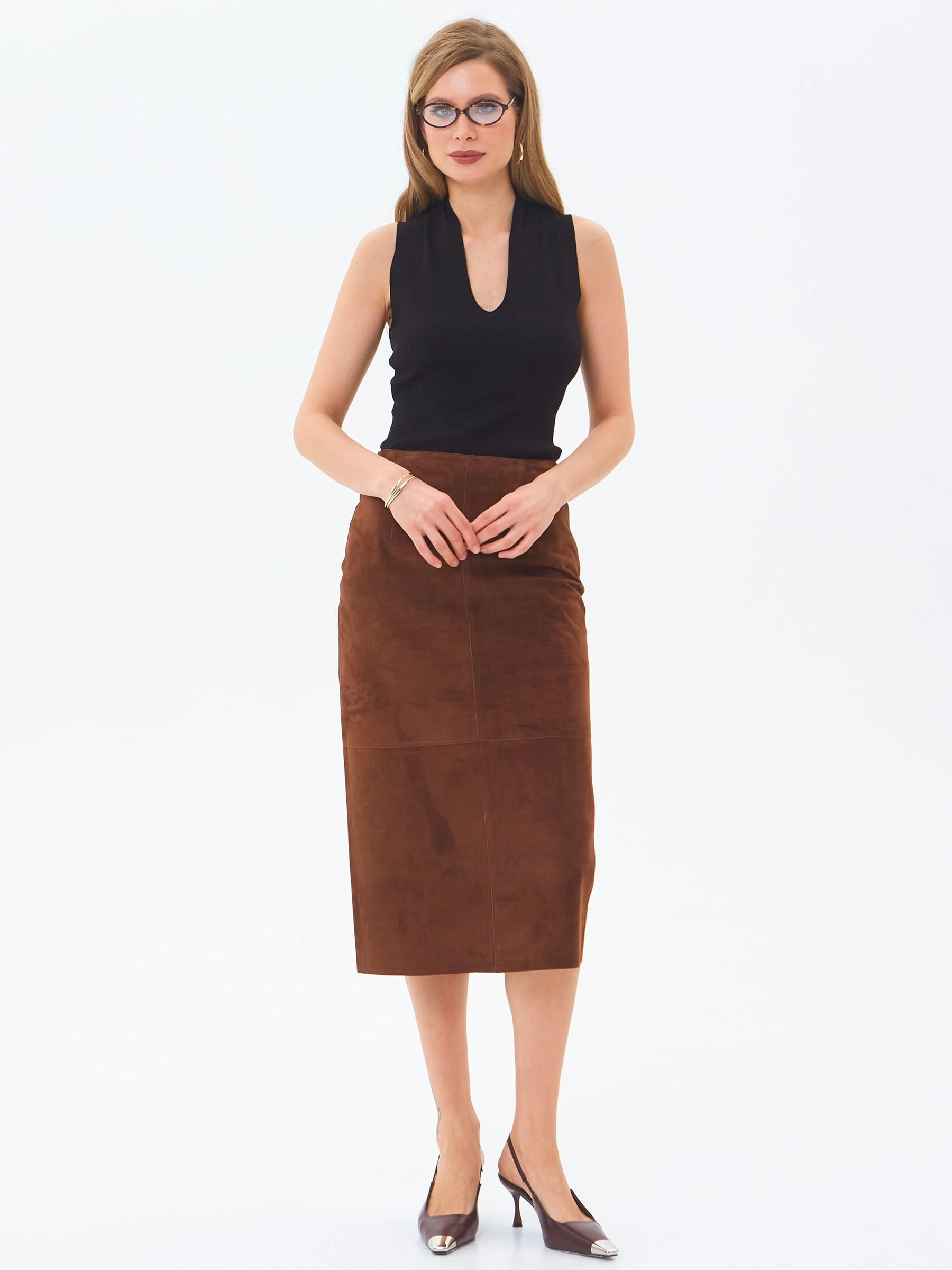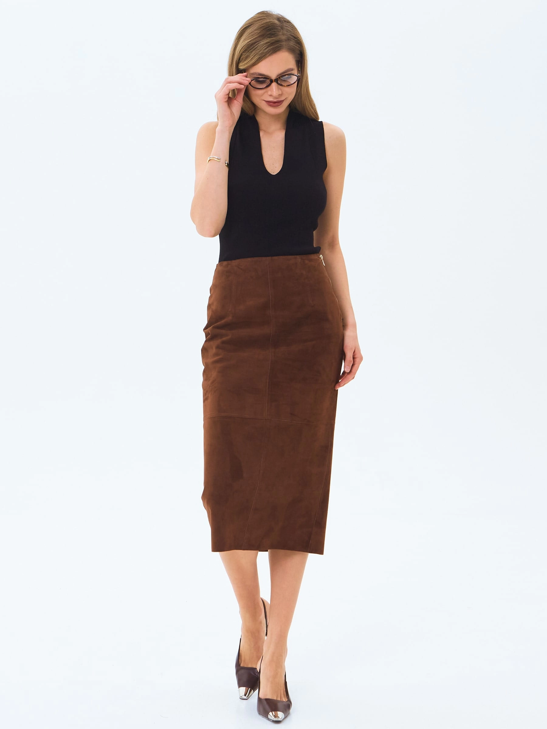 Женственная юбка-миди из натуральной замши с облегающим силуэтом сочетает элегантность и комфорт, мягко подчеркивая фигуру благодаря пластичности благородного материала. Высокая шлица сзади обеспечивает свободу движений, сохраняя при этом сдержанный характер модели, а боковая застежка на крупной молнии добавляет современную ноту классическому крою. Отсутствие подкладки подчеркивает природные качества натуральной замши - ее удивительную мягкость, естественную терморегуляцию и благородную матовую поверхность, которая со временем приобретает индивидуальный характер. Идеальная длина до середины икры позволяет создавать разнообразные образы: сочетайте юбку с объемными свитерами и ботинками для повседневного стиля, с утонченными блузами и лодочками для офисного лука или с кожаными жакетами для завершенного городского образа, используя специальные средства по уходу за натуральной замшей для сохранения безупречного вида изделия.