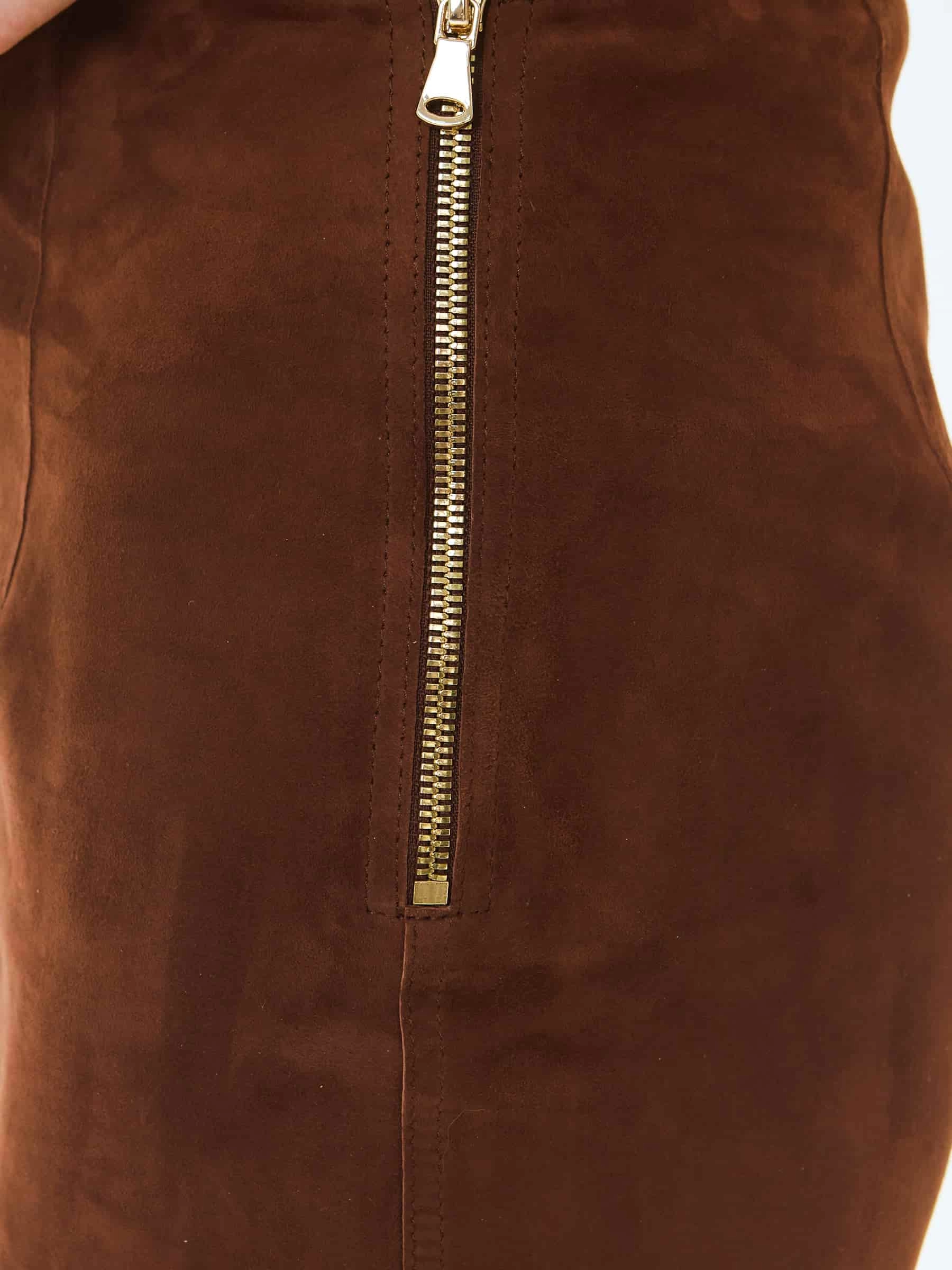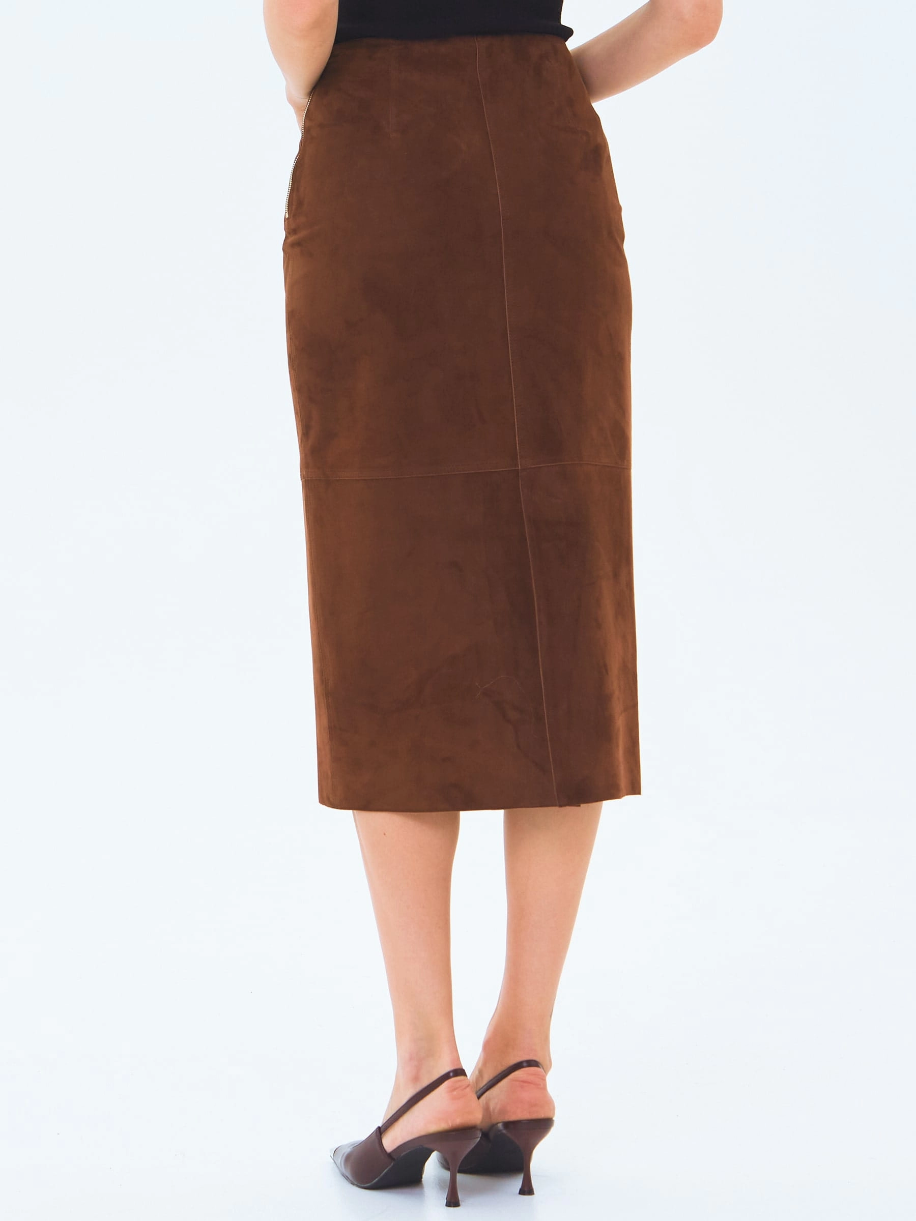 Товар замшевая юбка-миди 18з, коньячная, размер 42, артикул 85990 выполнен из натуральной замши с застежкой молния. Рассчитан на сезон: весна-лето. Длина изделия 77 см, силуэт прямой.