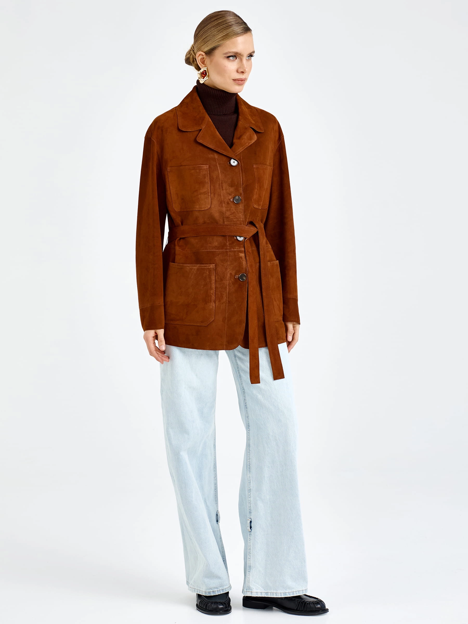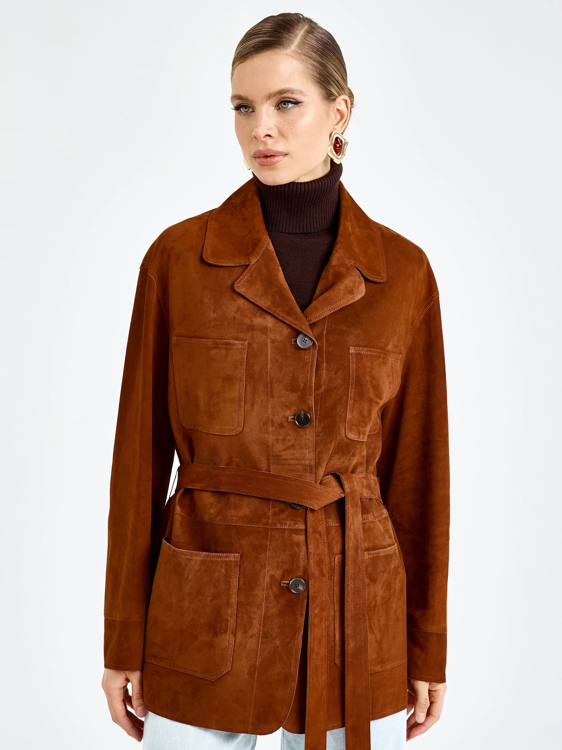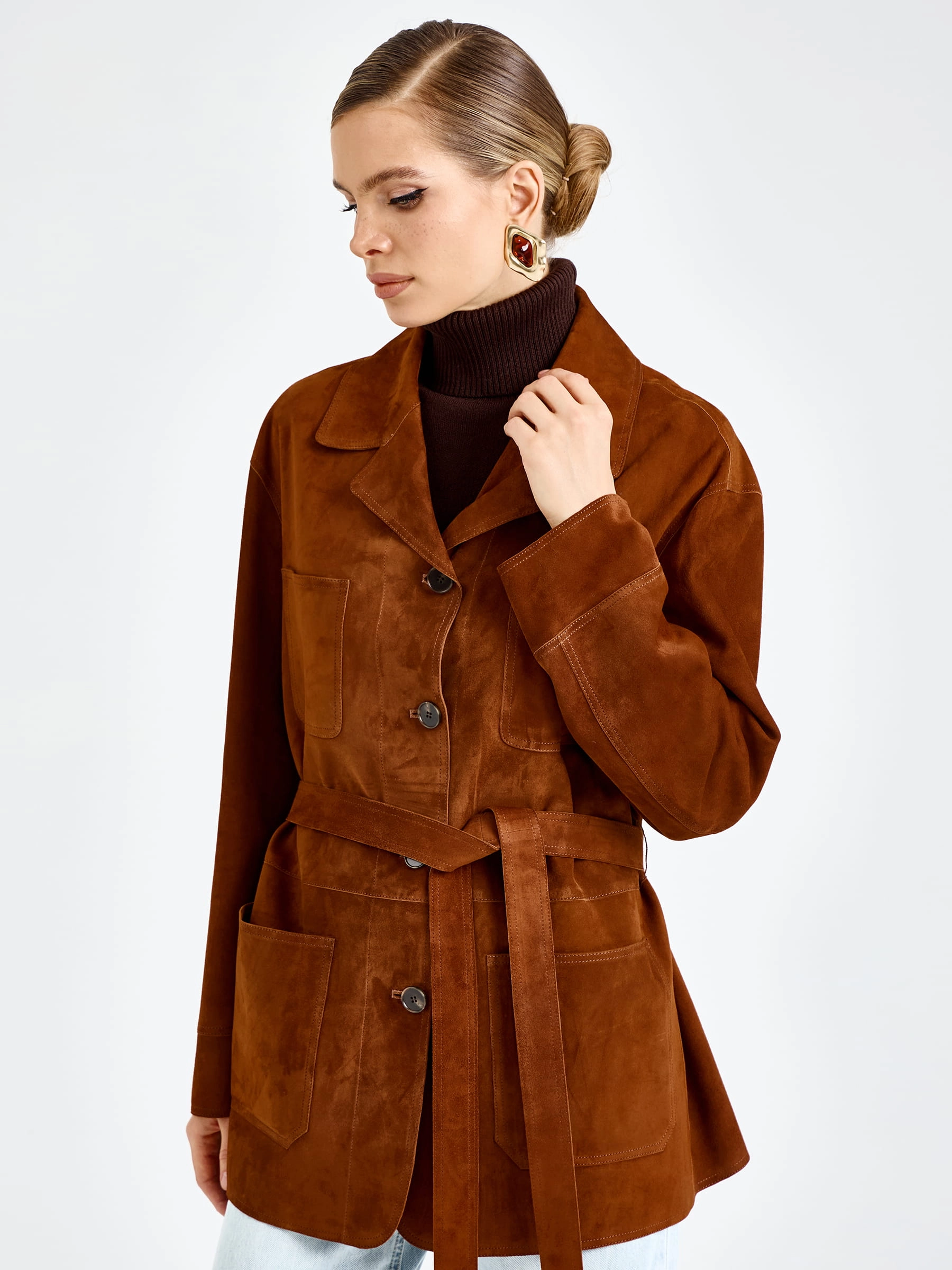 Женская замшевая куртка премиум-класса благородном цвете виски — воплощение повседневного комфорта и безупречного стиля для весенне-летнего сезона: модель прямого силуэта длиной 74 см выполнили из мягкой бархатистой замши премиум-класса, которая дарит благородную матовую фактуру и нежность, а спущенная линия плеча обеспечивает свободу движений и создает расслабленный современный силуэт. Лаконичный отложной воротник добавляет модели классического звучания, а главным функциональным и декоративным акцентом стали четыре вместительных накладных кармана, которые усиливают практичность и придают образу выразительность; удобная застежка на пуговицы и отсутствие подкладки делают куртку легкой и комфортной.