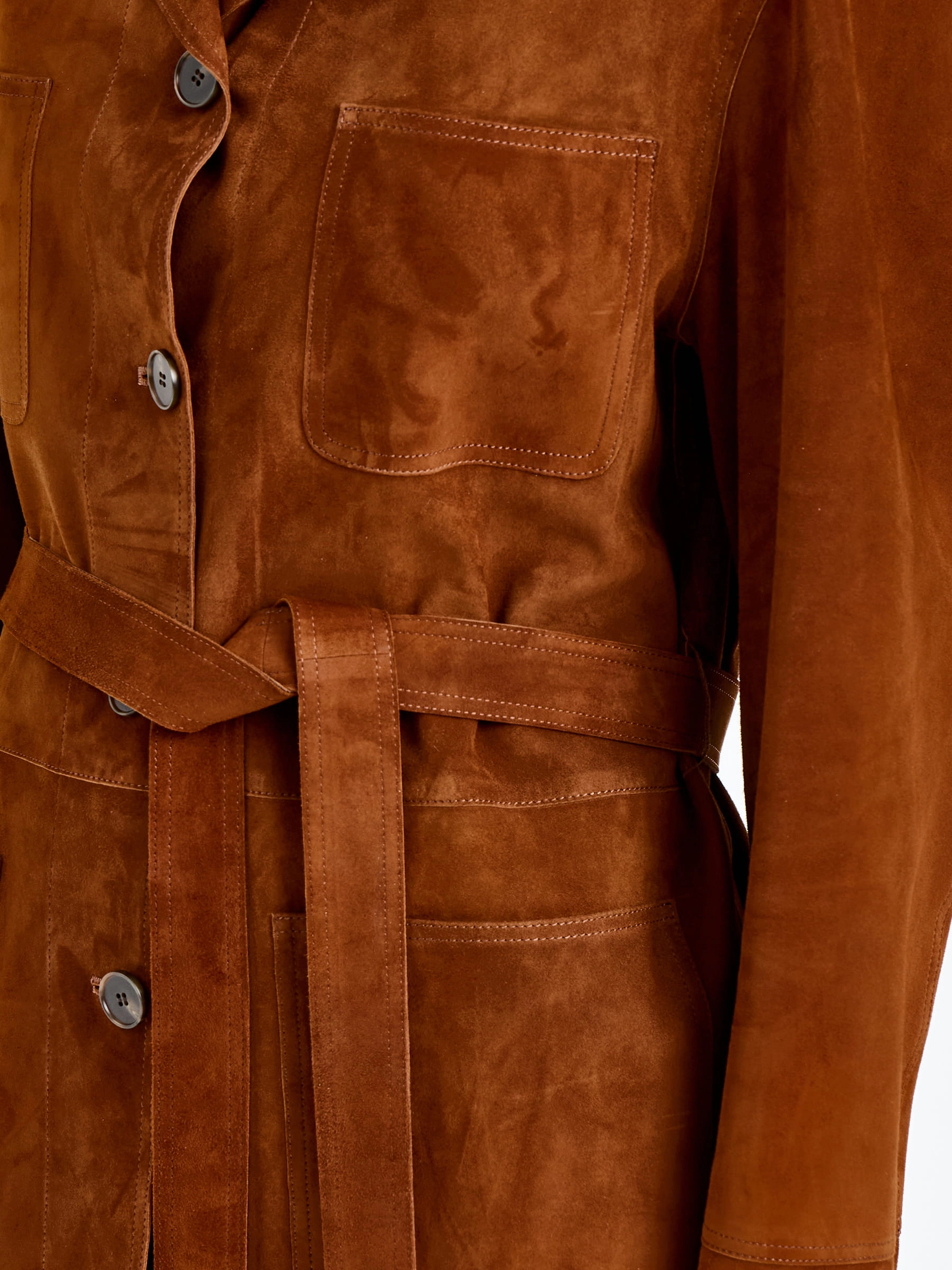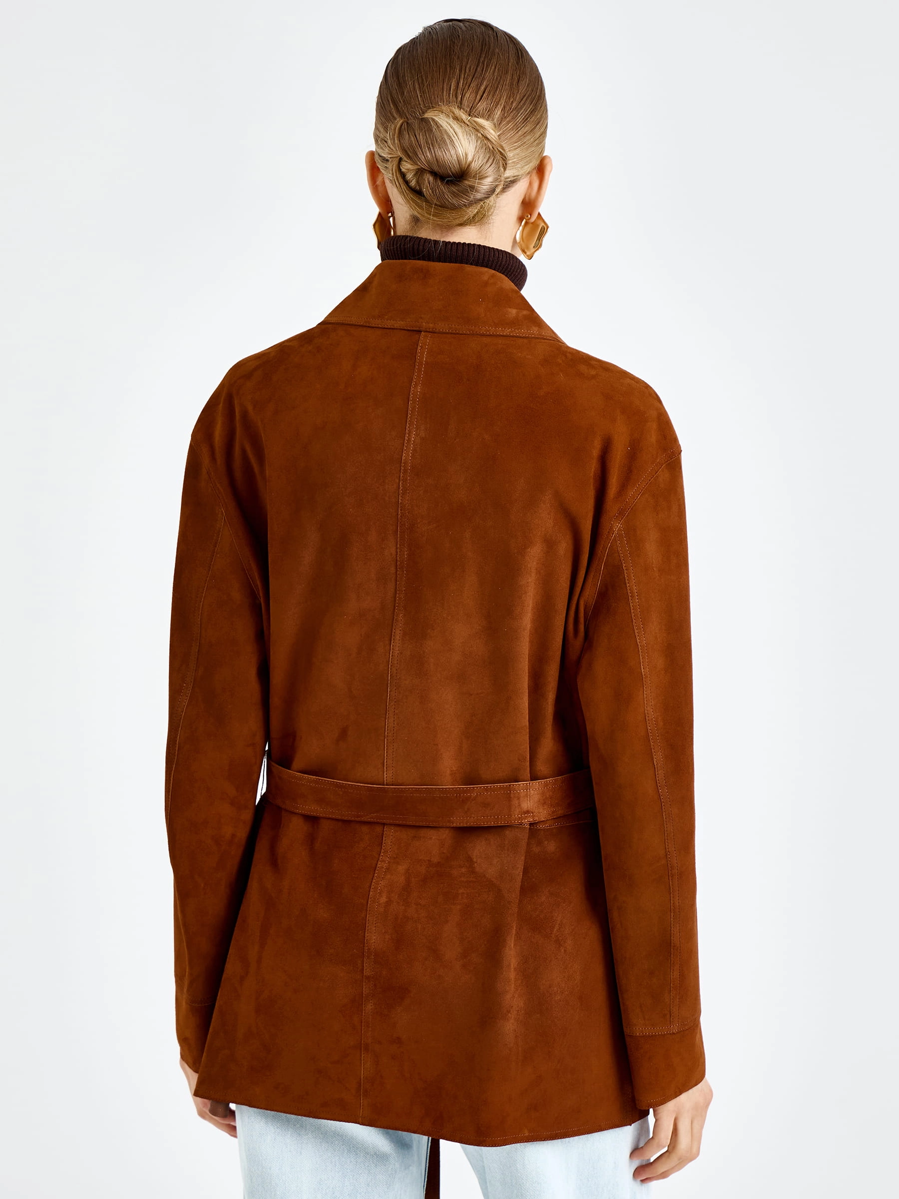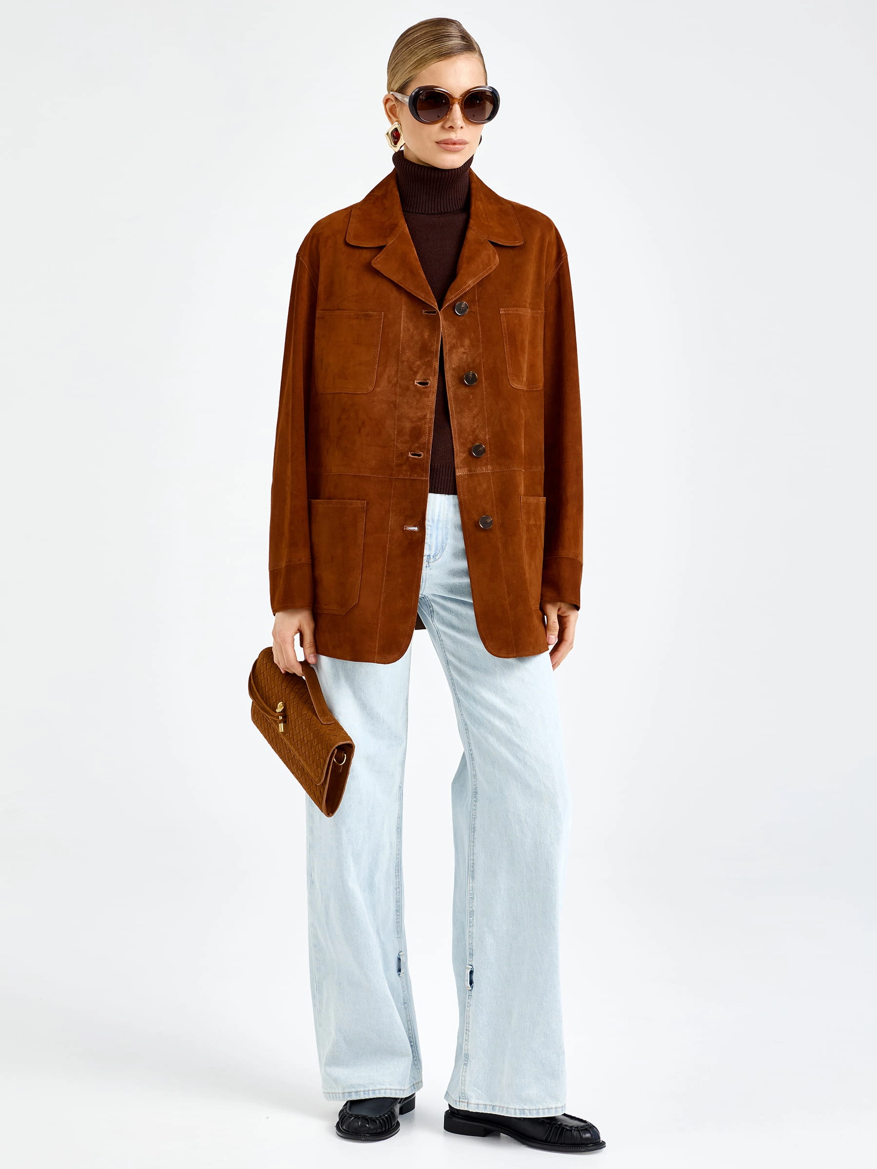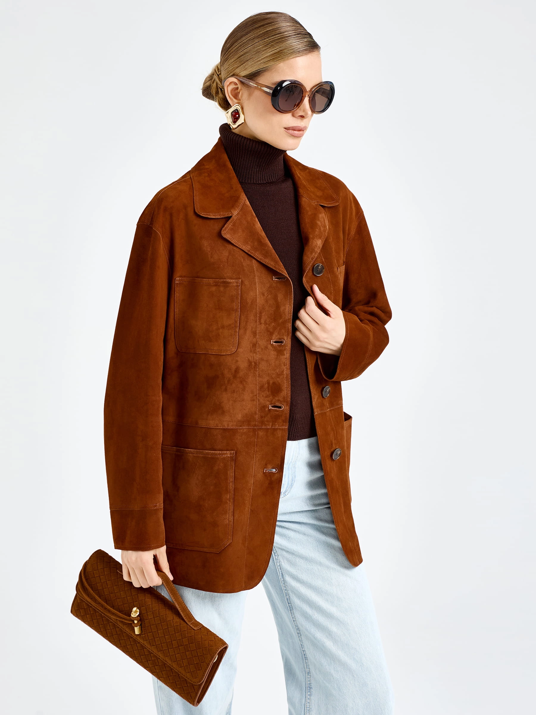 Женская замшевая куртка премиум-класса благородном цвете виски — воплощение повседневного комфорта и безупречного стиля для весенне-летнего сезона: модель прямого силуэта длиной 74 см выполнили из мягкой бархатистой замши премиум-класса, которая дарит благородную матовую фактуру и нежность, а спущенная линия плеча обеспечивает свободу движений и создает расслабленный современный силуэт. Лаконичный отложной воротник добавляет модели классического звучания, а главным функциональным и декоративным акцентом стали четыре вместительных накладных кармана, которые усиливают практичность и придают образу выразительность; удобная застежка на пуговицы и отсутствие подкладки делают куртку легкой и комфортной.