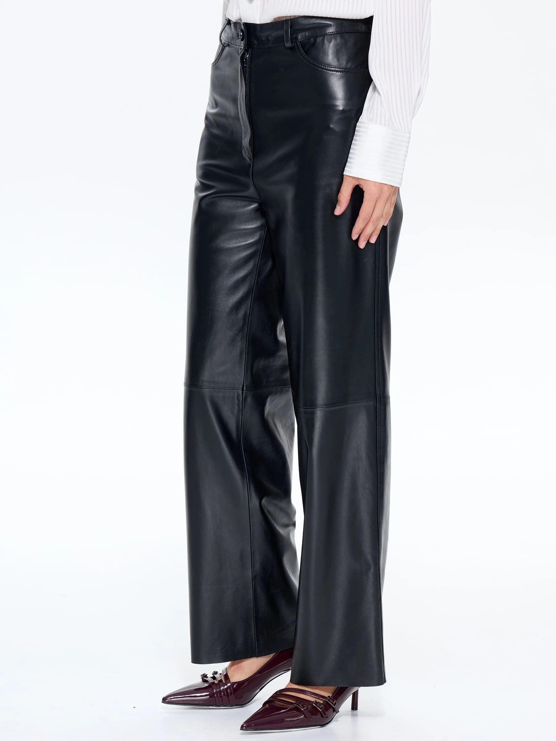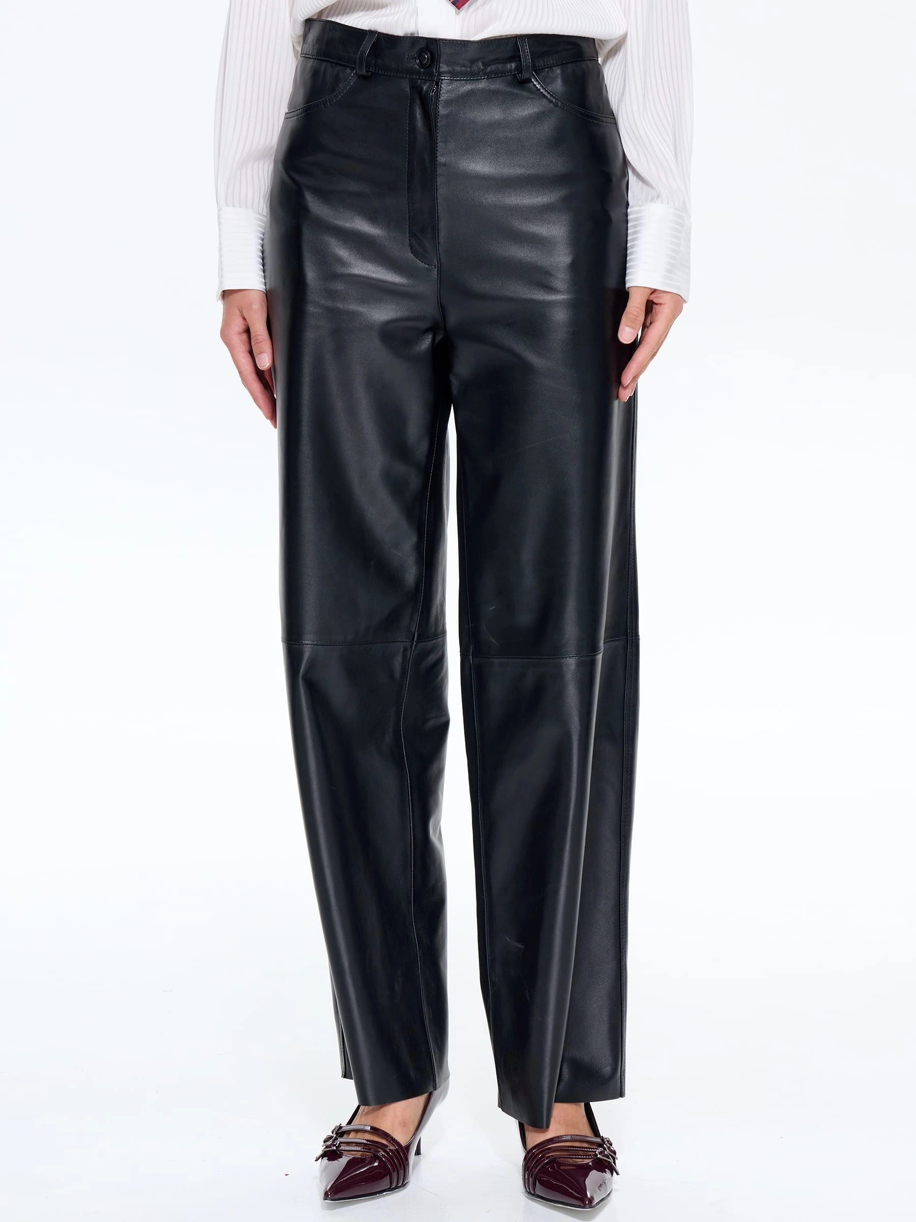 Женские кожаные брюки прямого кроя из натуральной глянцевой овечьей кожи черного цвета сочетают в себе комфорт и элегантность. Завышенная талия визуально удлиняет ноги, подчеркивает женственный силуэт и корректирует линию живота, а свободное облегание в области бедер и коленей обеспечивает легкость движений. Практичность модели дополняют четыре функциональных кармана, а универсальный дизайн позволяет создавать стильные образы как с кроссовками и балетками, так и с каблуками. Застежка на молнию гарантирует удобство носки, а высококачественная натуральная кожа с матовой фактурой подчеркивает безупречный вкус и статусность обладательницы.
