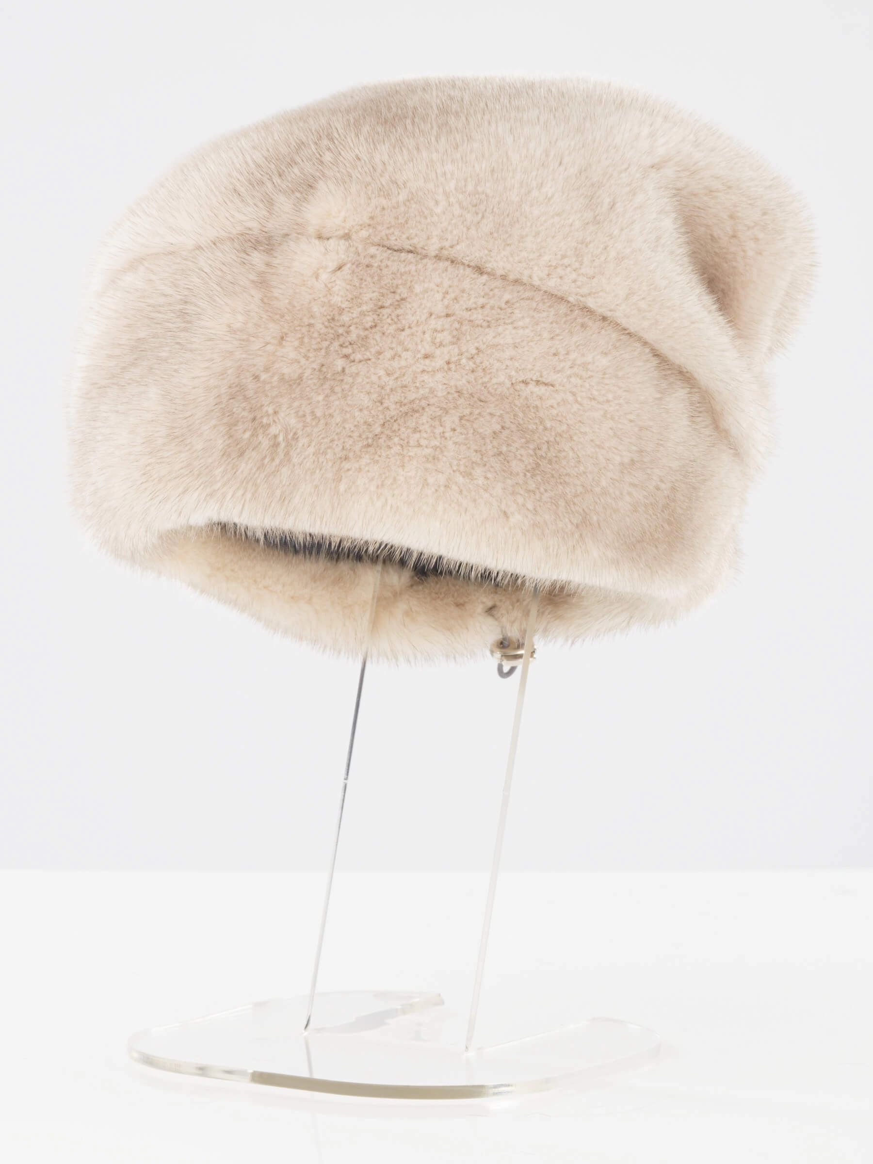 Шапка изготовлена из натурального меха норки удивительного оттенка, когда вроде бы основной цвет меха один, светлый, но при этом он переливается совершенно неожиданным для такой подпуши сероватым или голубоватым оттенком, меняя цвет, играя оттенками в зависимости от освещения. Модель имеет небольшой объем, представляет собой гармоничное сочетание комфорта и уюта.