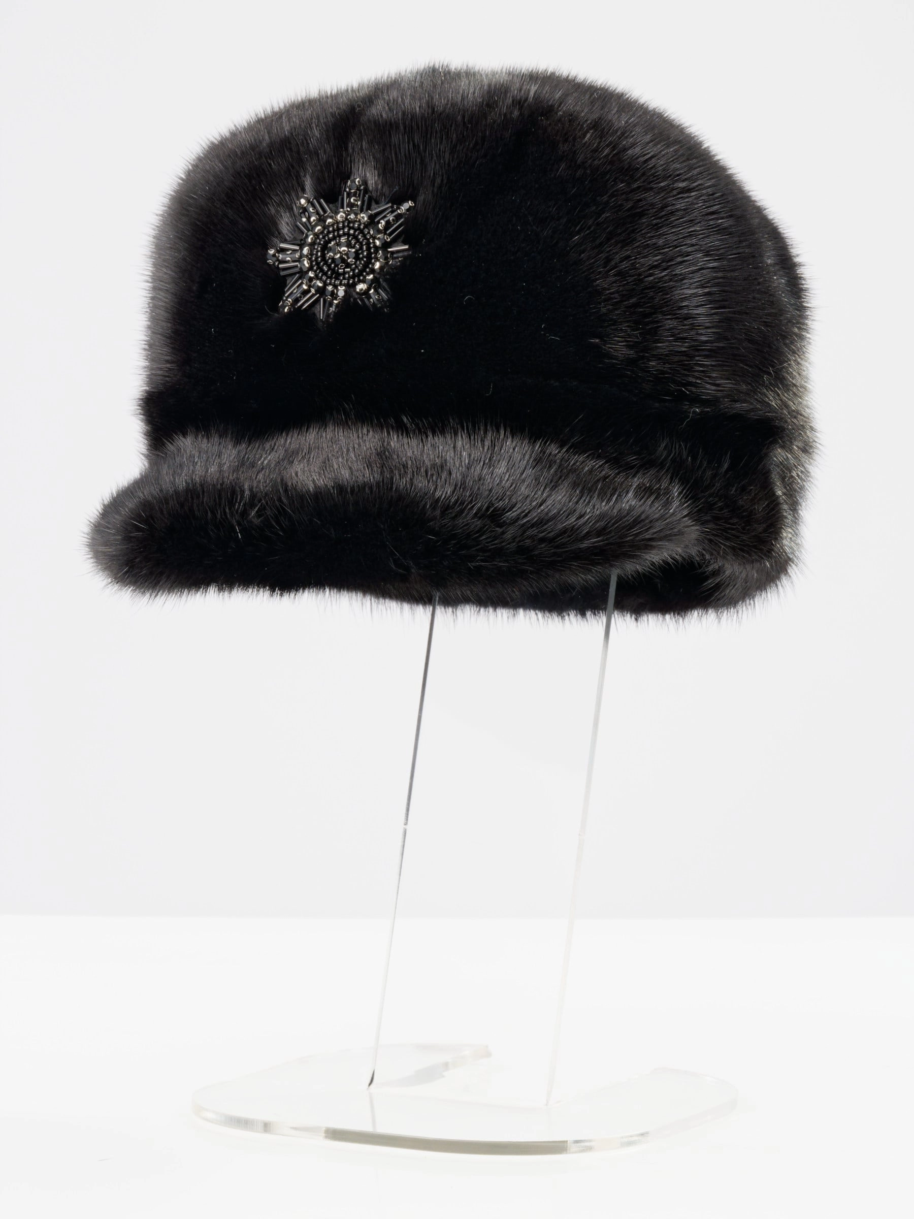 Для создания кепи с широким козырьком мастера использовали стриженый мех норки, окрашенный в черный цвет. Изделие из такого меха не только красиво и приятно на ощупь, но и практично: оно хорошо сохраняет тепло. Его можно носить как в классическом, повседневном и даже спортивном стиле.