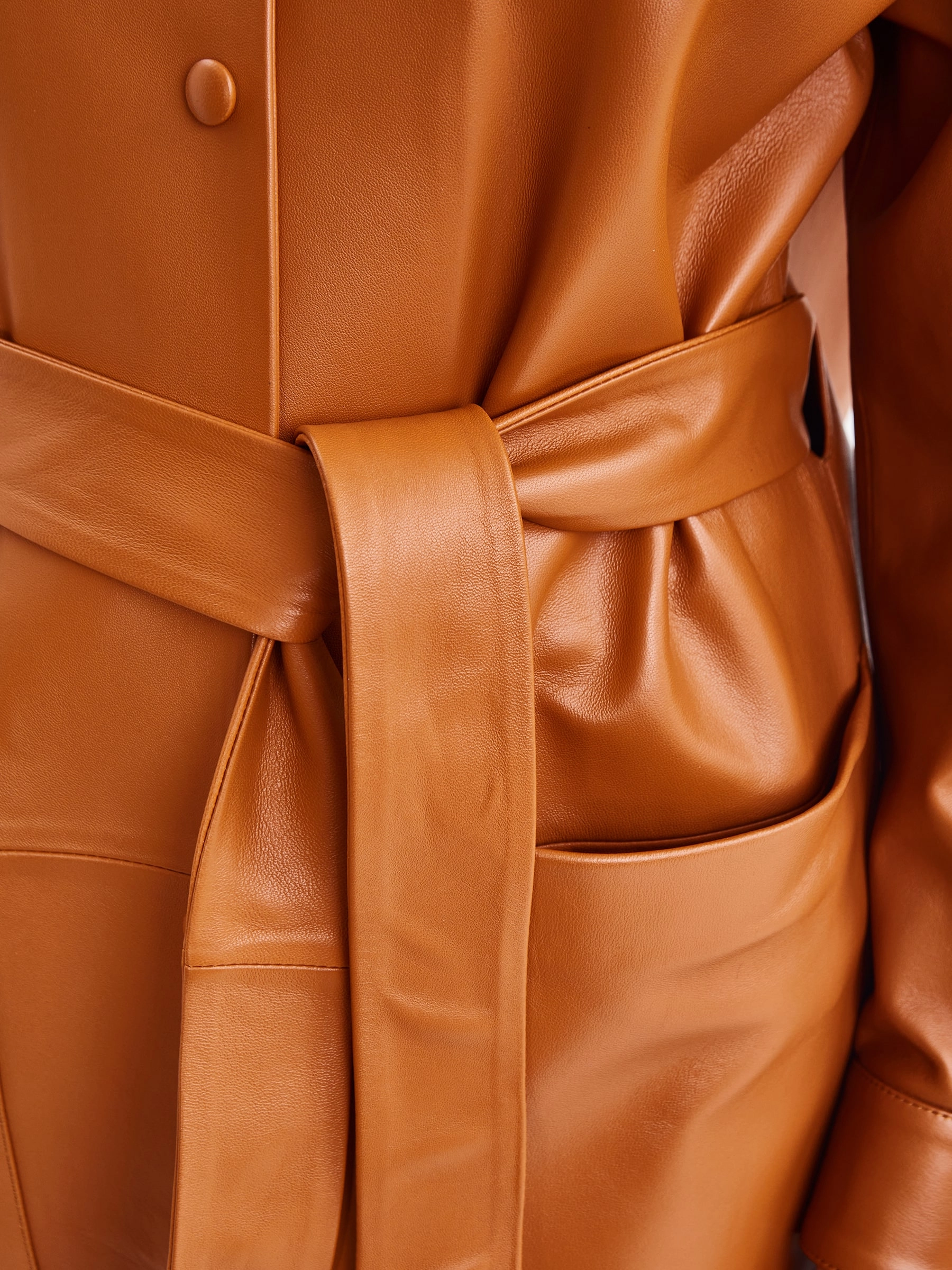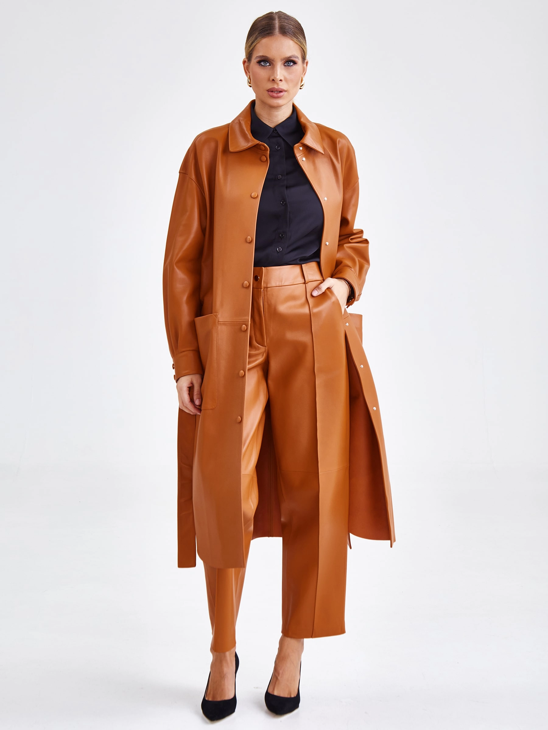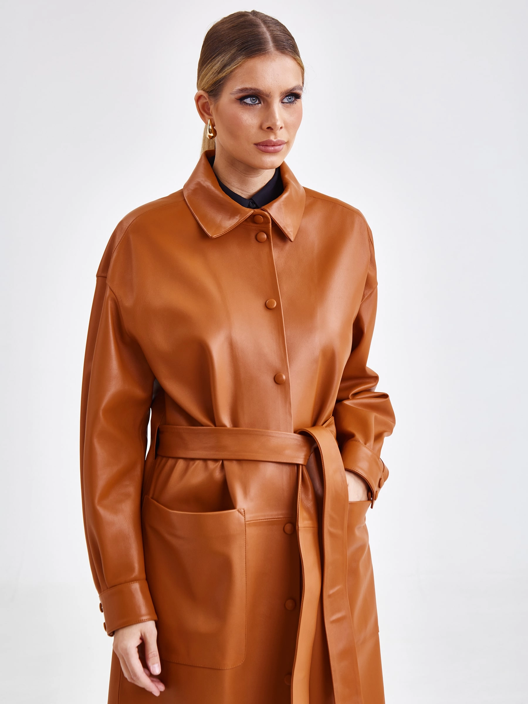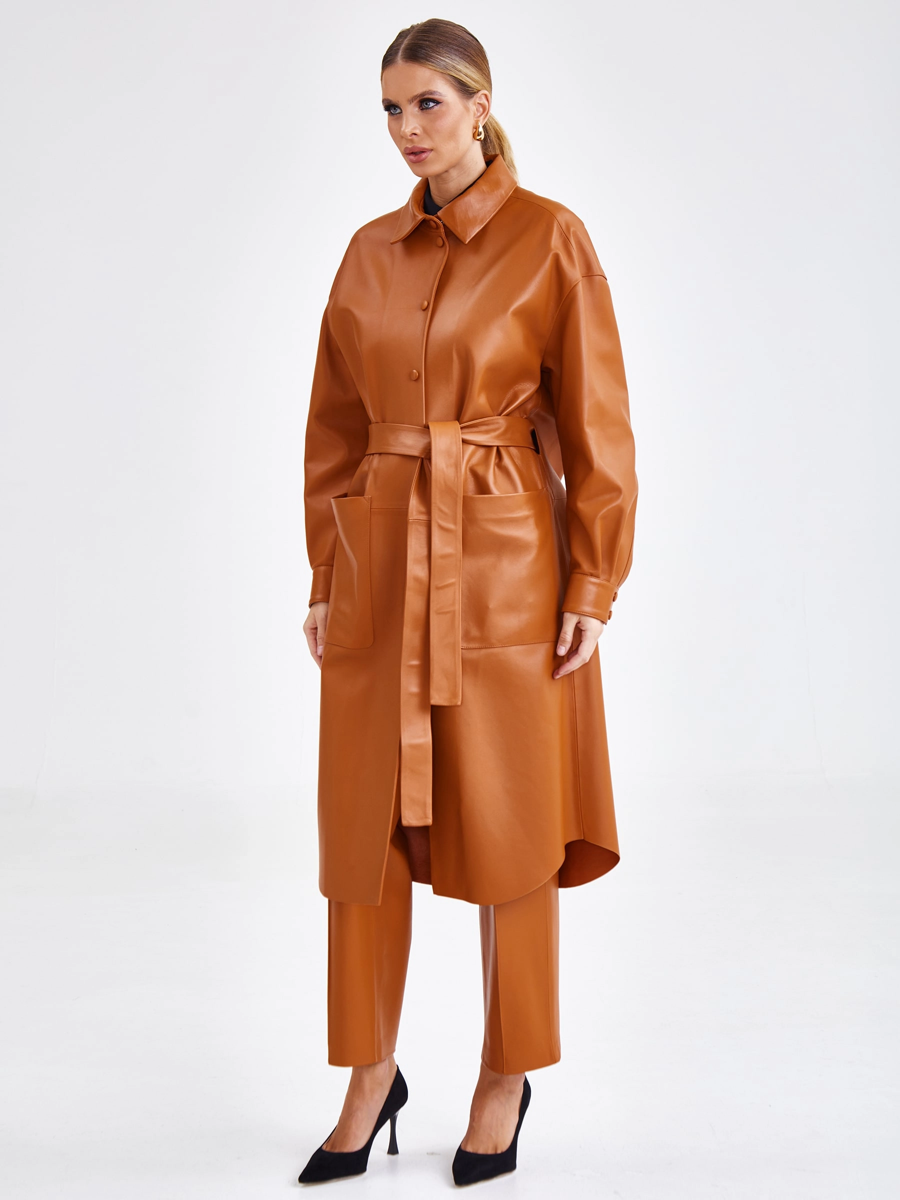 Плащ прямого кроя с отложным воротником, двумя накладными карманами и поясом - лентой. Изделие выполнено из гладкой натуральной кожи премиум класса.