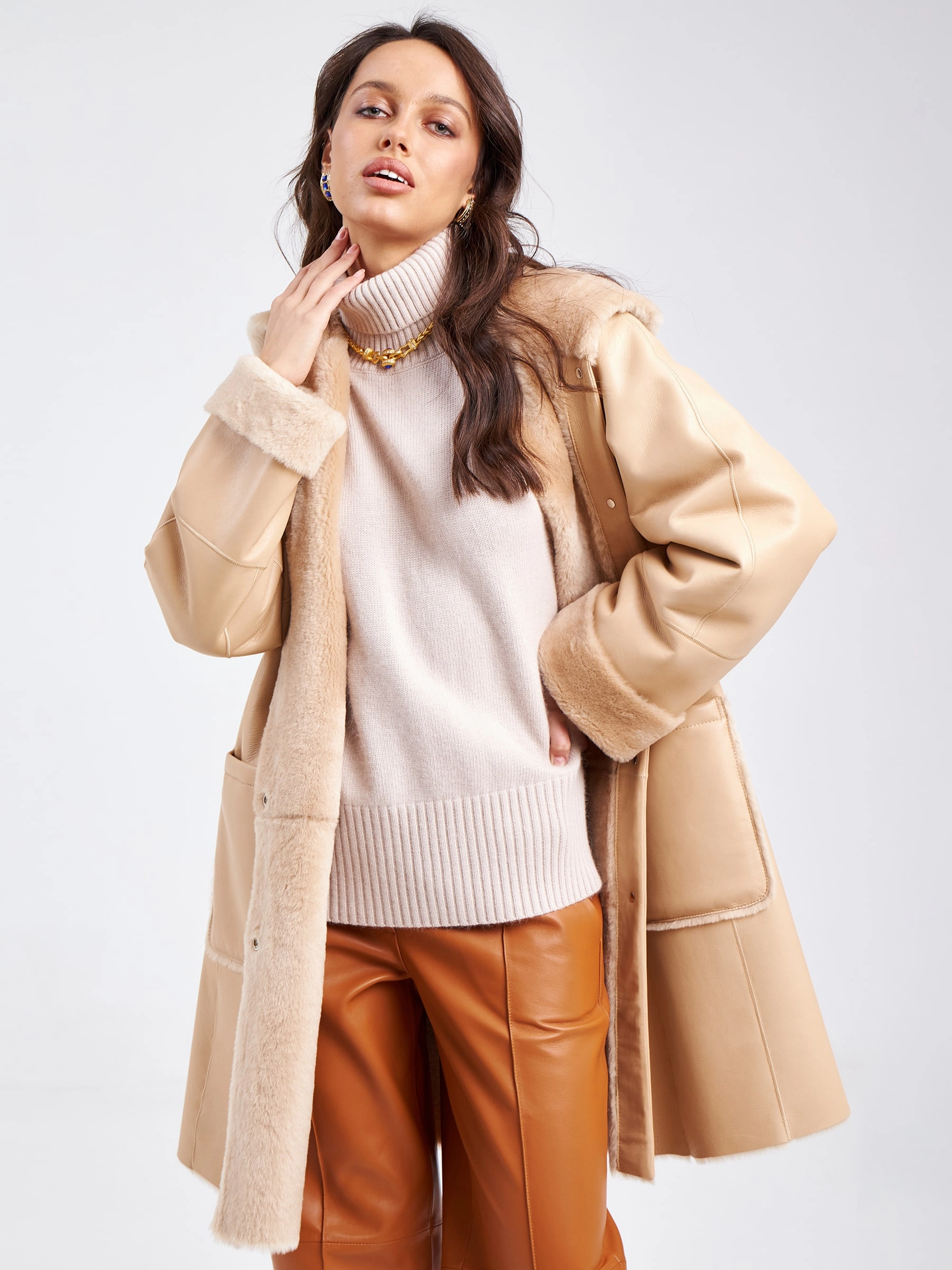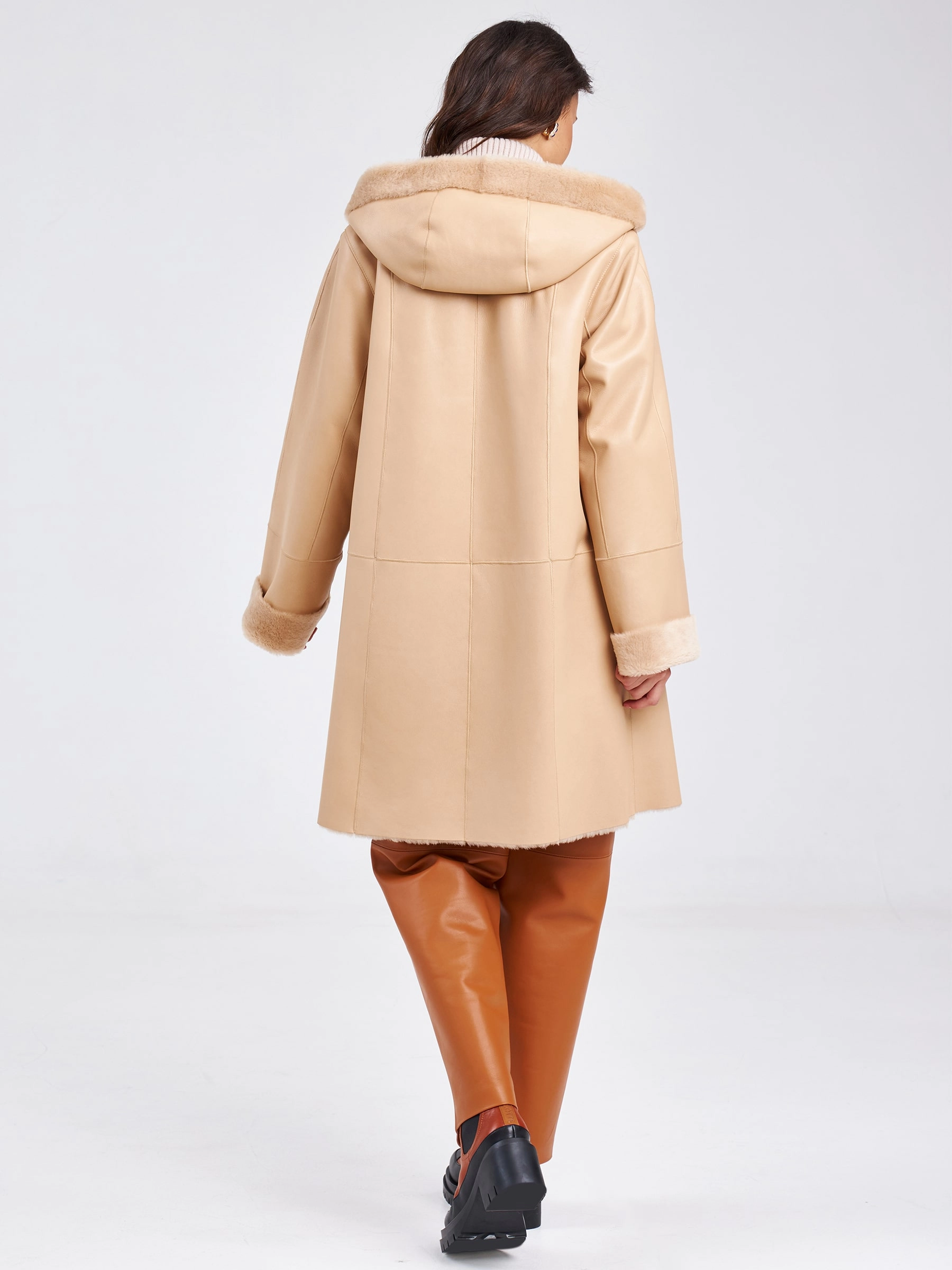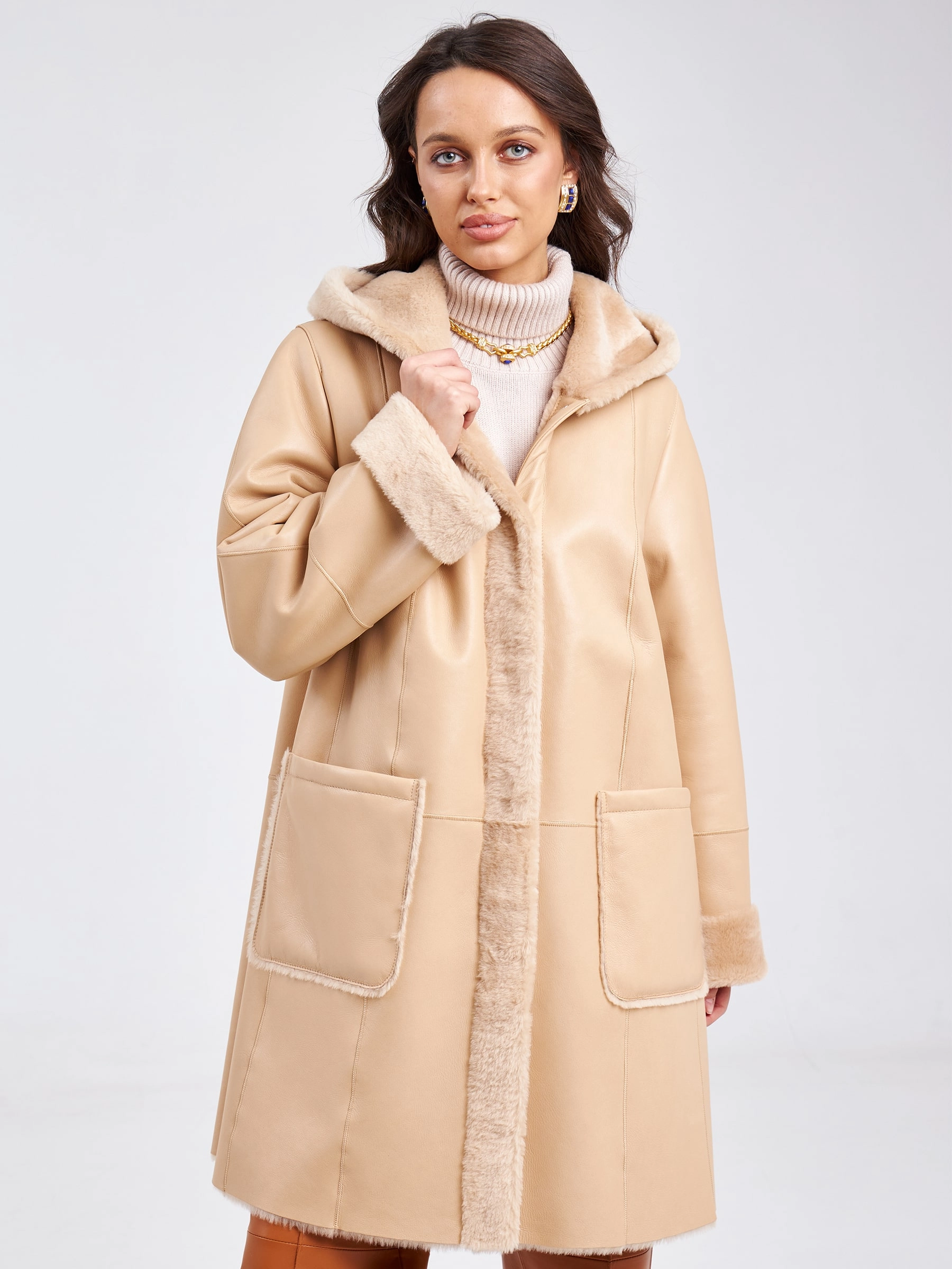 Женское классическое пальто с капюшоном из натуральной овчины премиум класса 2004, бежевое, размер 54, артикул 63810