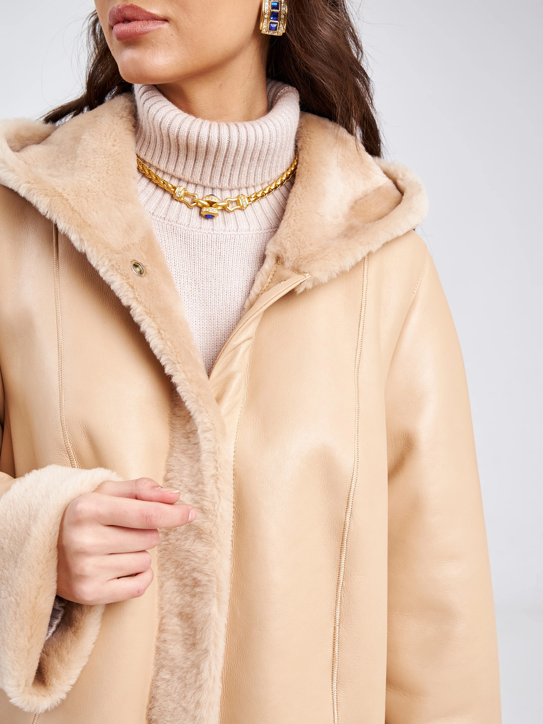 Товар женское классическое пальто с капюшоном из натуральной овчины премиум класса 2004, бежевое, размер 54, артикул 63810 выполнен из овчина "мерино" с застежкой пуговицы. Рассчитан на сезон: зима. Длина изделия 90 см, силуэт свободный.
