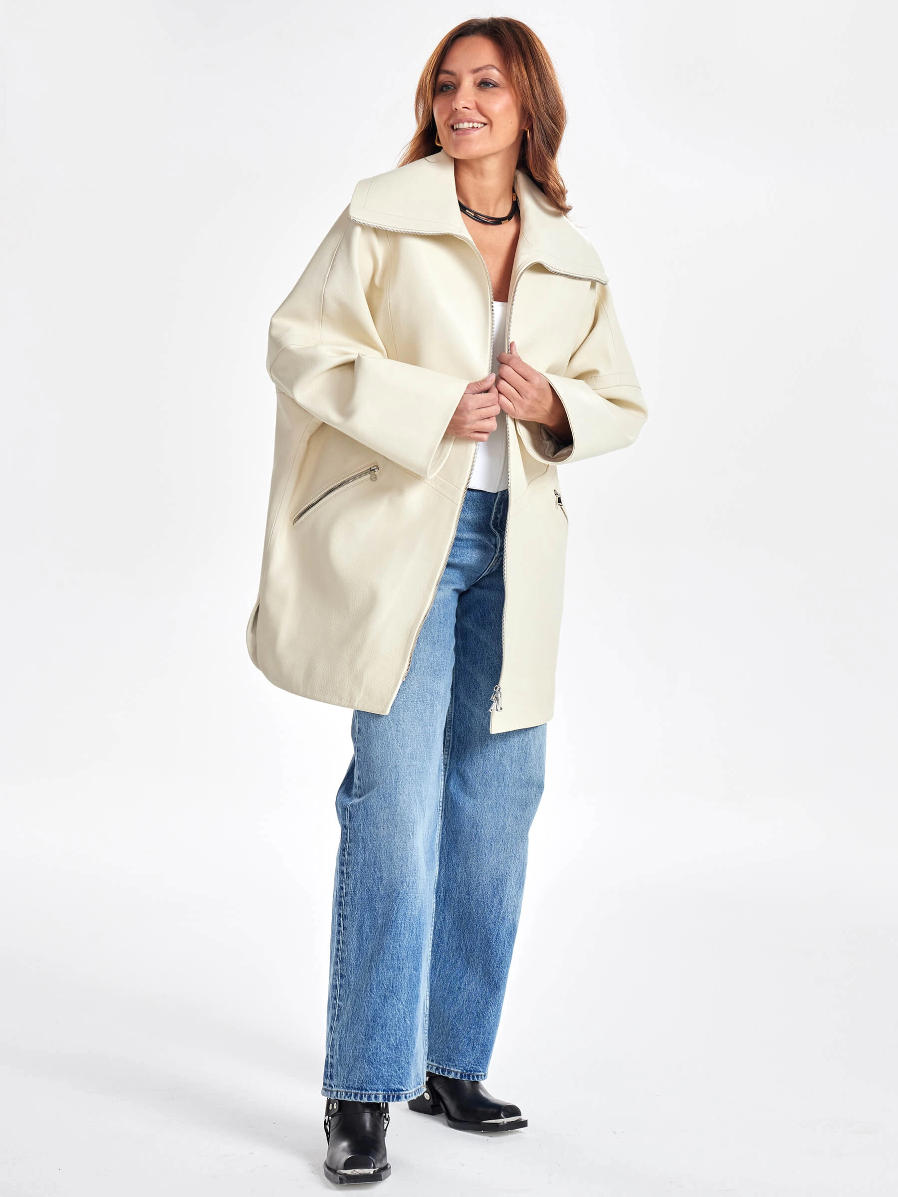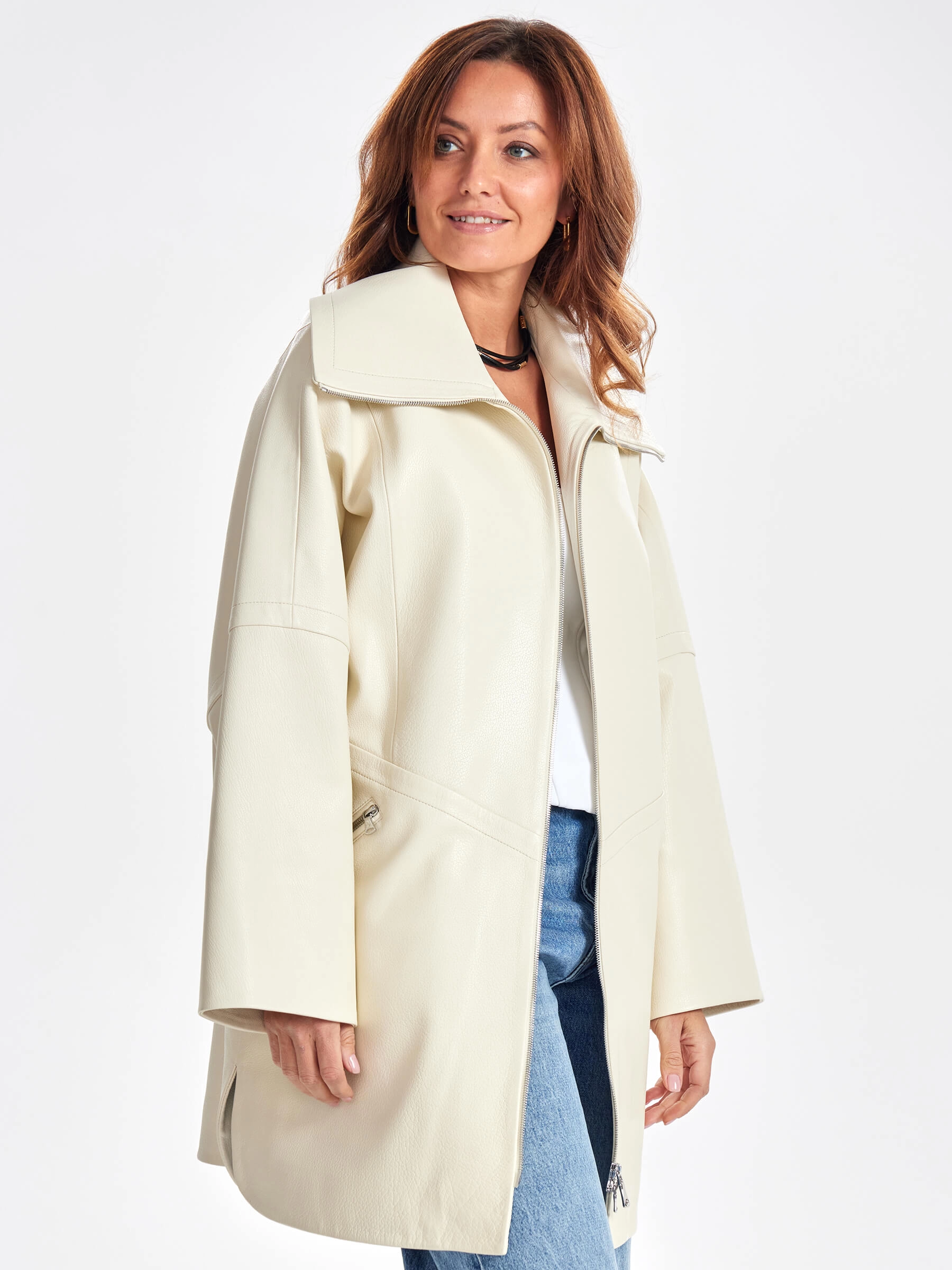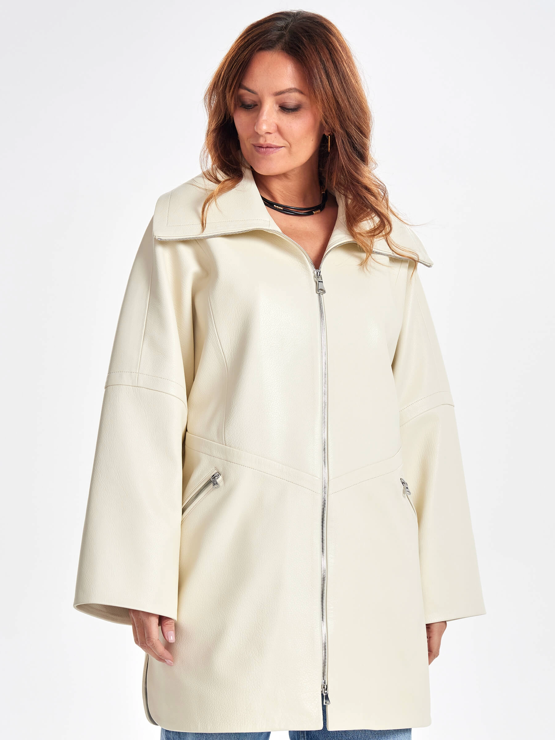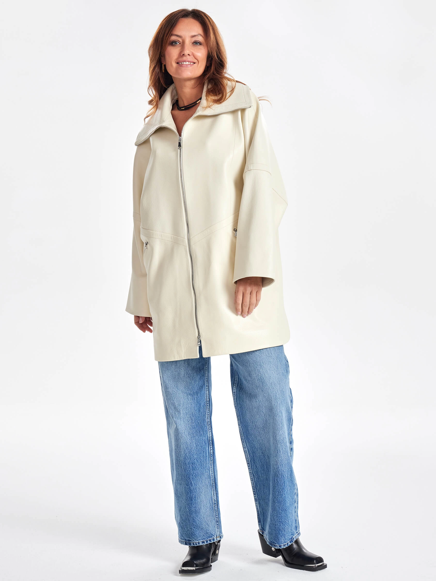 Товар женское кожаное полупальто оверсайз премиум класса 3057, белое, размер 50, артикул 64030 выполнен из натуральной кожи с застежкой молния. Рассчитан на сезон: весна-осень. Длина изделия 87 см, силуэт оверсайз.