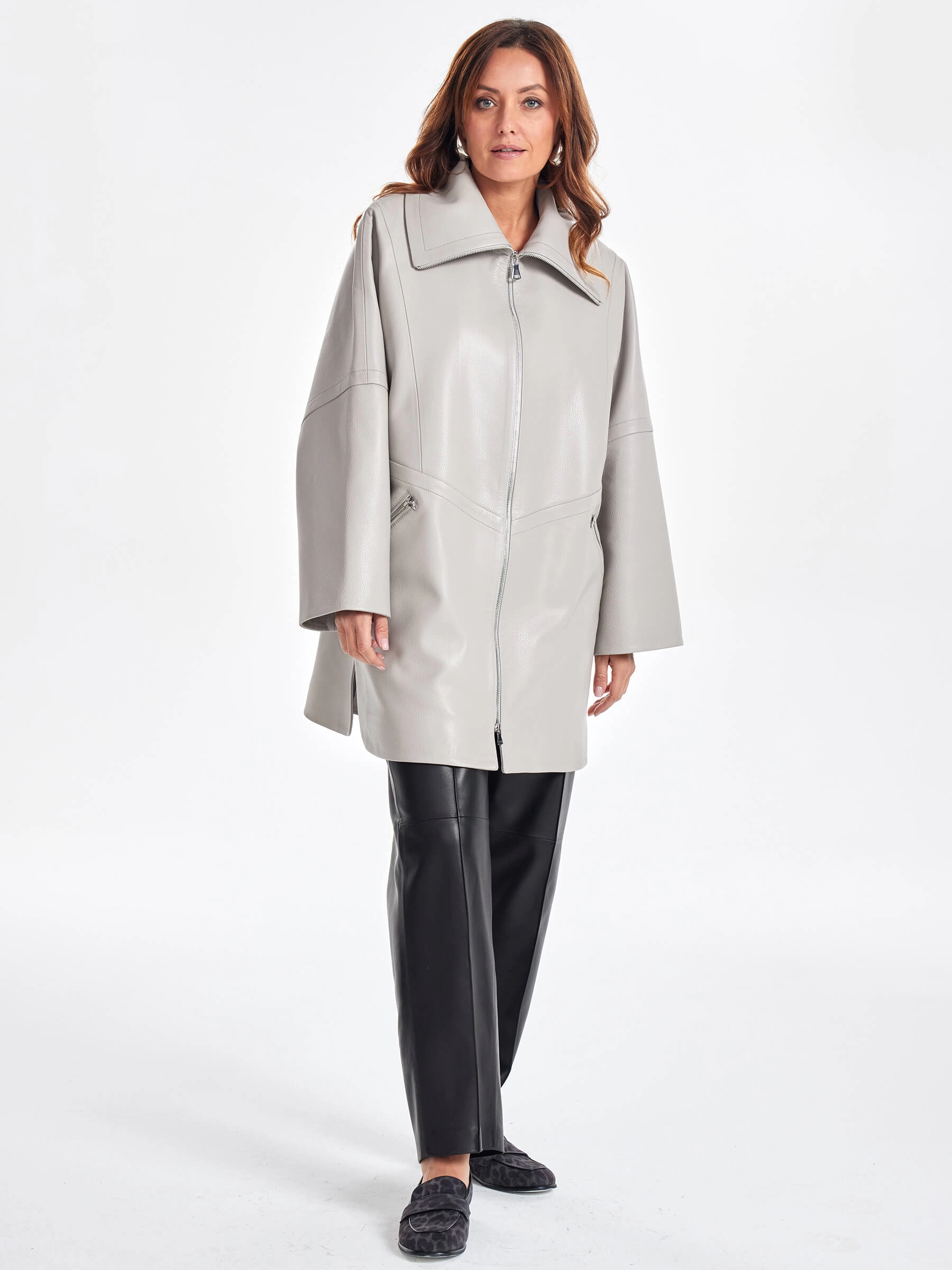 Товар женское кожаное полупальто оверсайз премиум класса 3057, серое, размер 52, артикул 64040 выполнен из натуральной кожи с застежкой молния. Рассчитан на сезон: весна-осень. Длина изделия 87 см, силуэт оверсайз.
