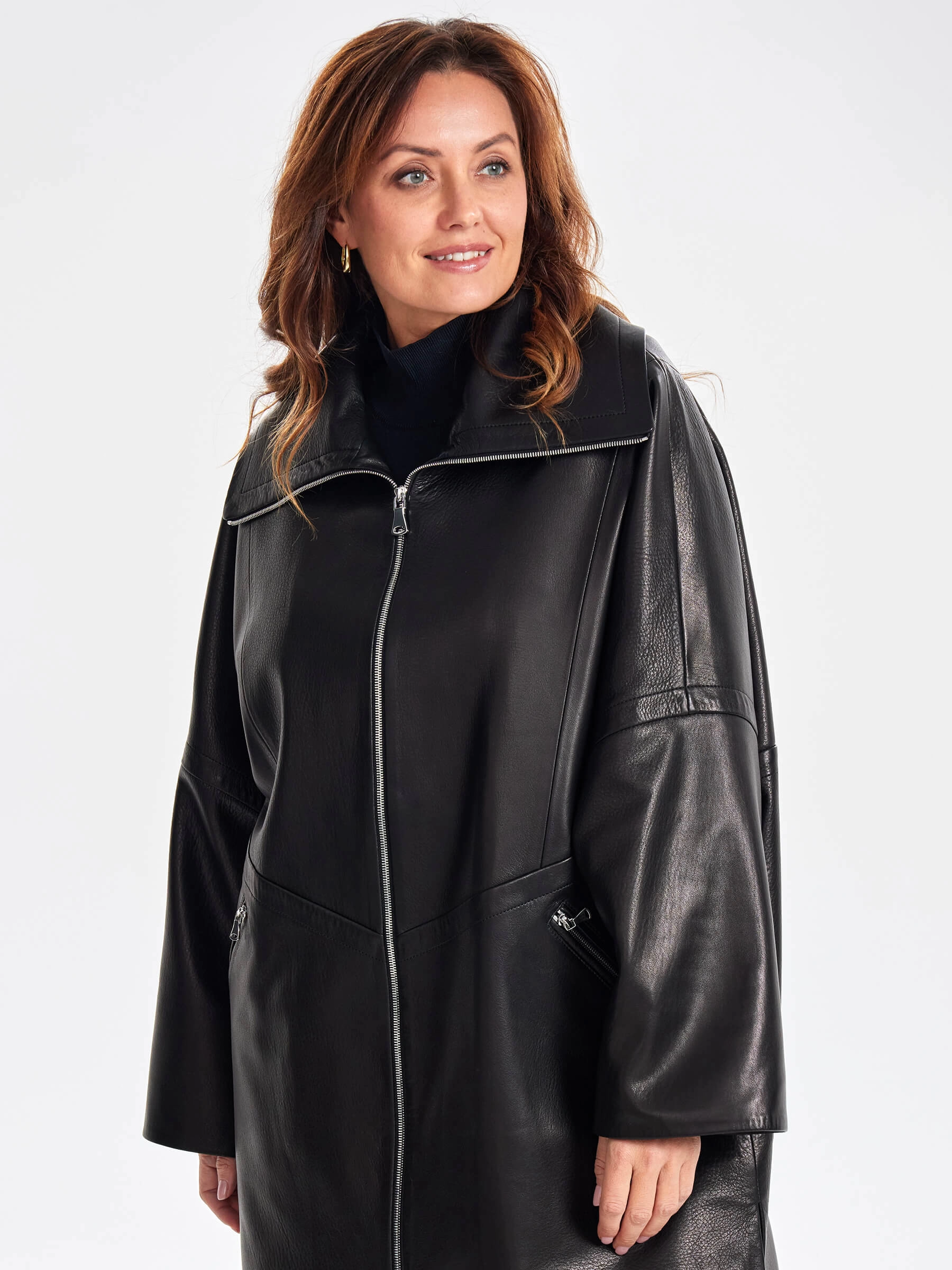 Товар женское кожаное полупальто оверсайз премиум класса 3057, черное, размер 52, артикул 64020 выполнен из натуральной кожи с застежкой молния. Рассчитан на сезон: весна-осень. Длина изделия 87 см, силуэт оверсайз.