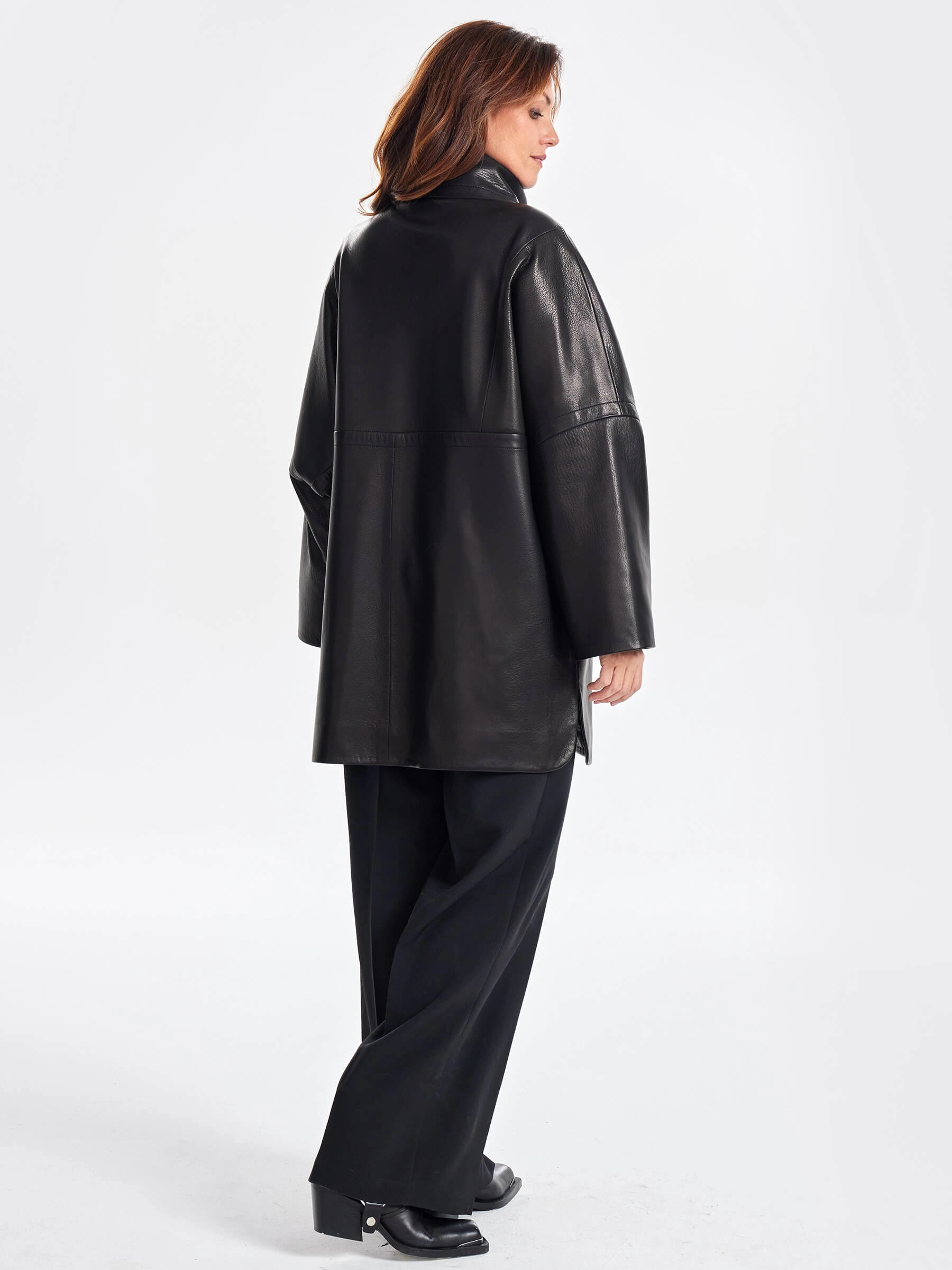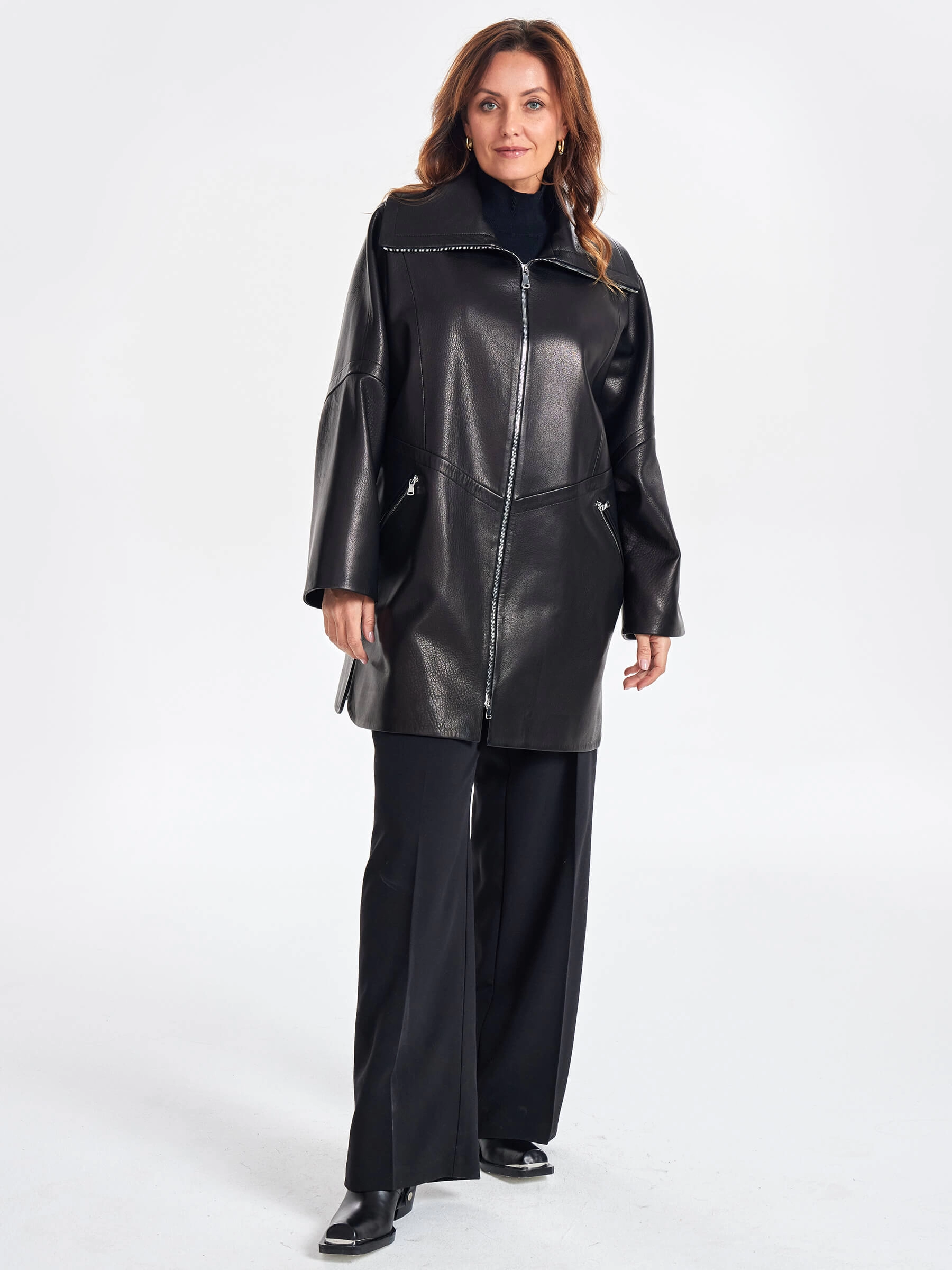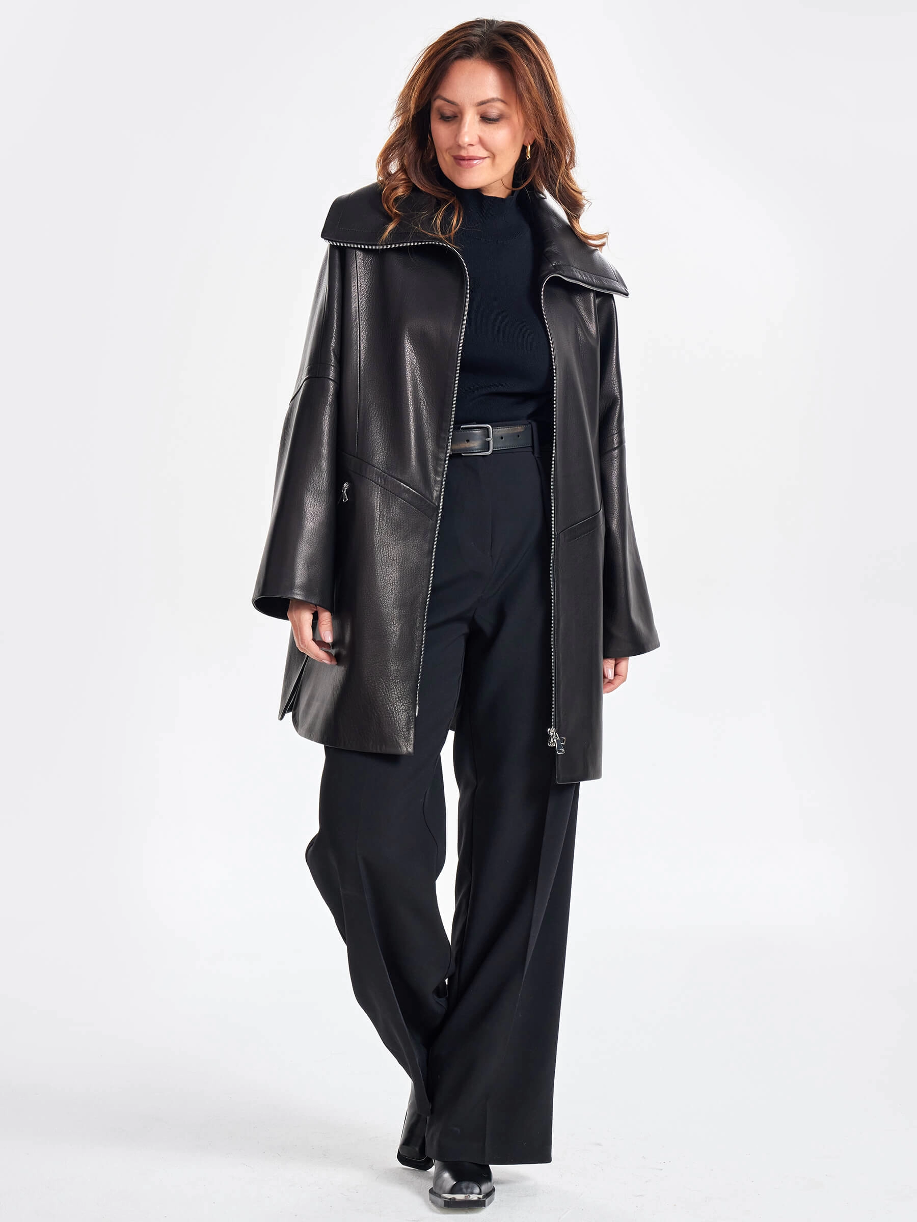 Стильное полупальто выполненное из фактурной мягкой кожи премиум класса гармонично завершит ваш ежедневный образ. Изделие свободного кроя, со спущенной линией плеч застегивающейся встречной молнией серебристого цвета. Дополнительный комфорт в ветренную погоду добавит воротник-стойка, Для большей свободы движения предусмотрены боковые разрезы.