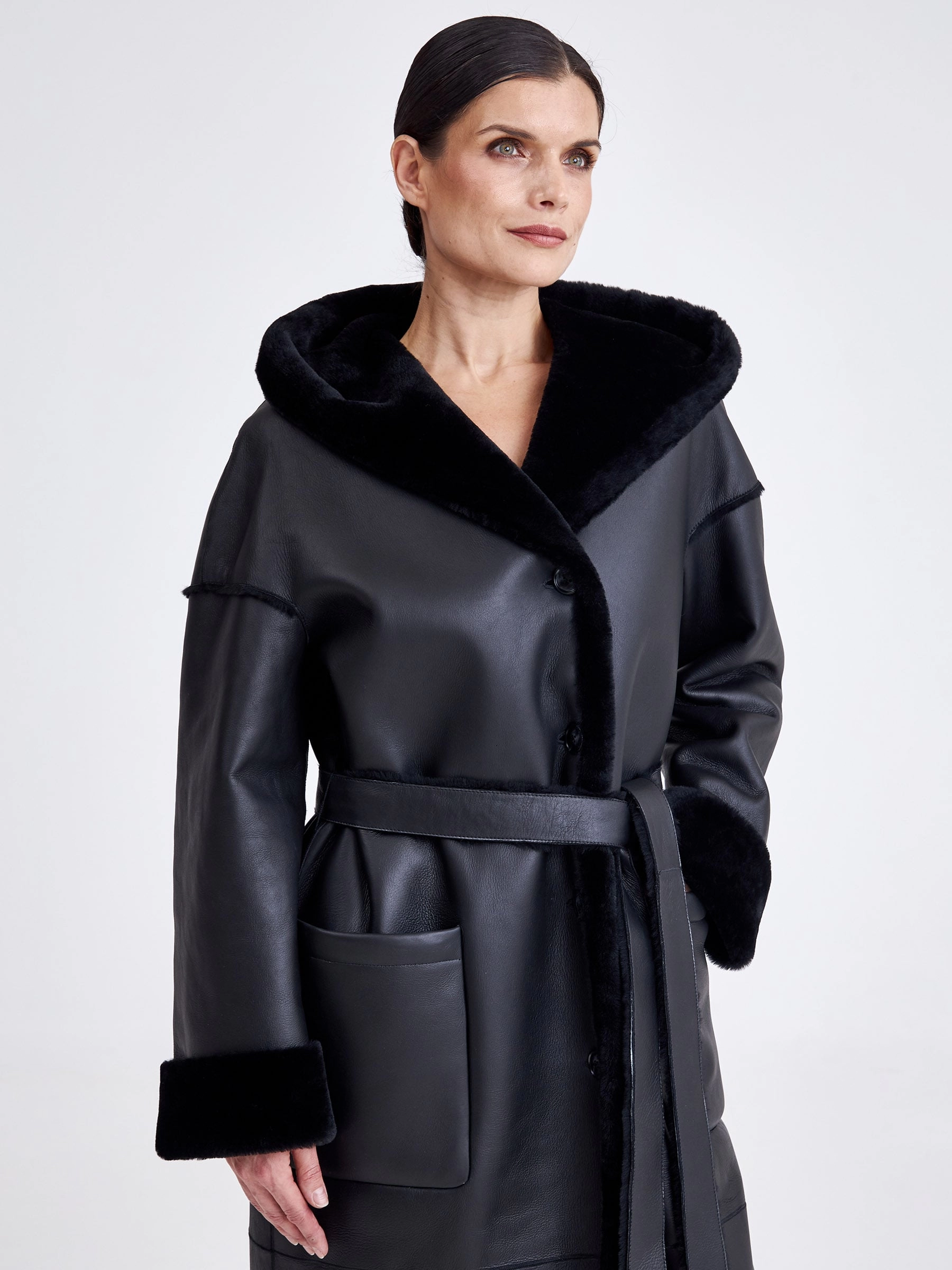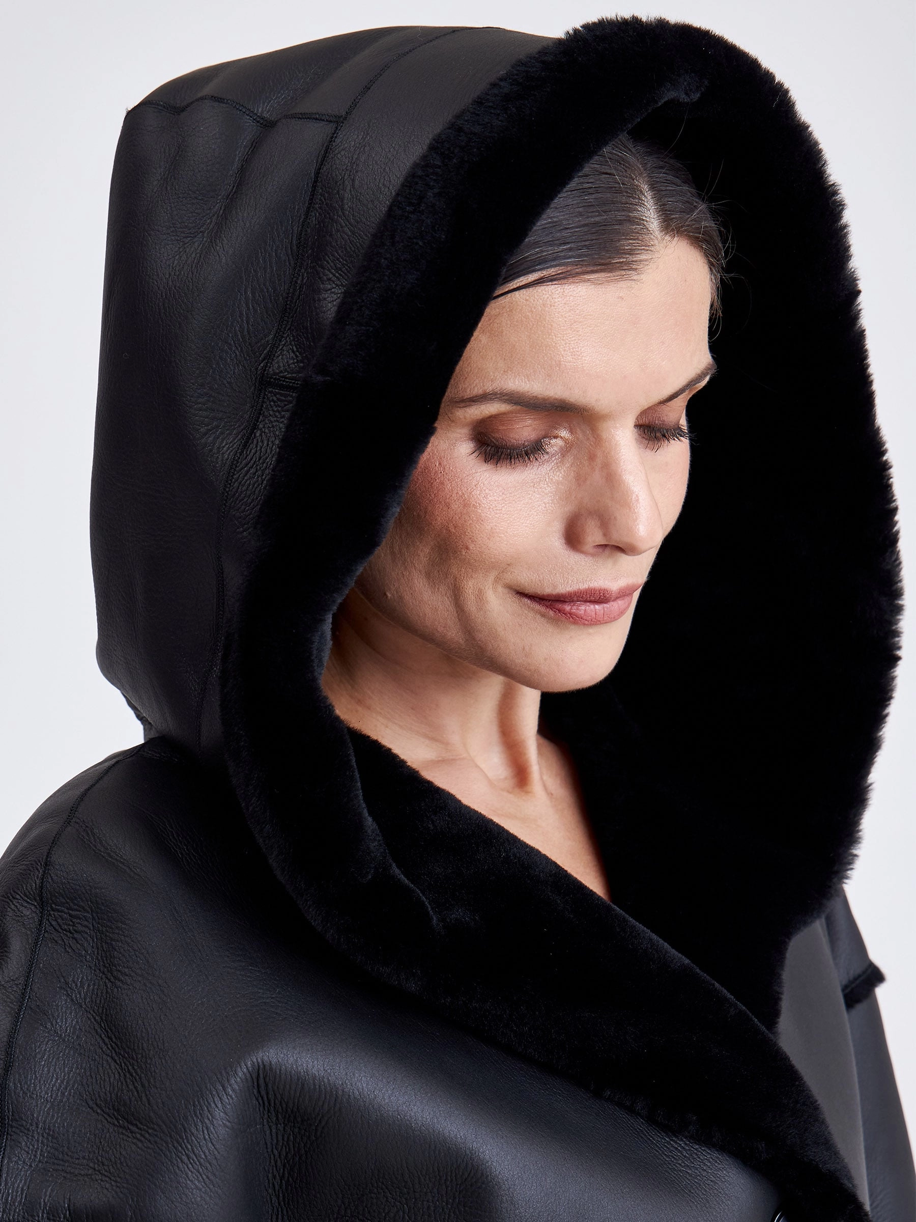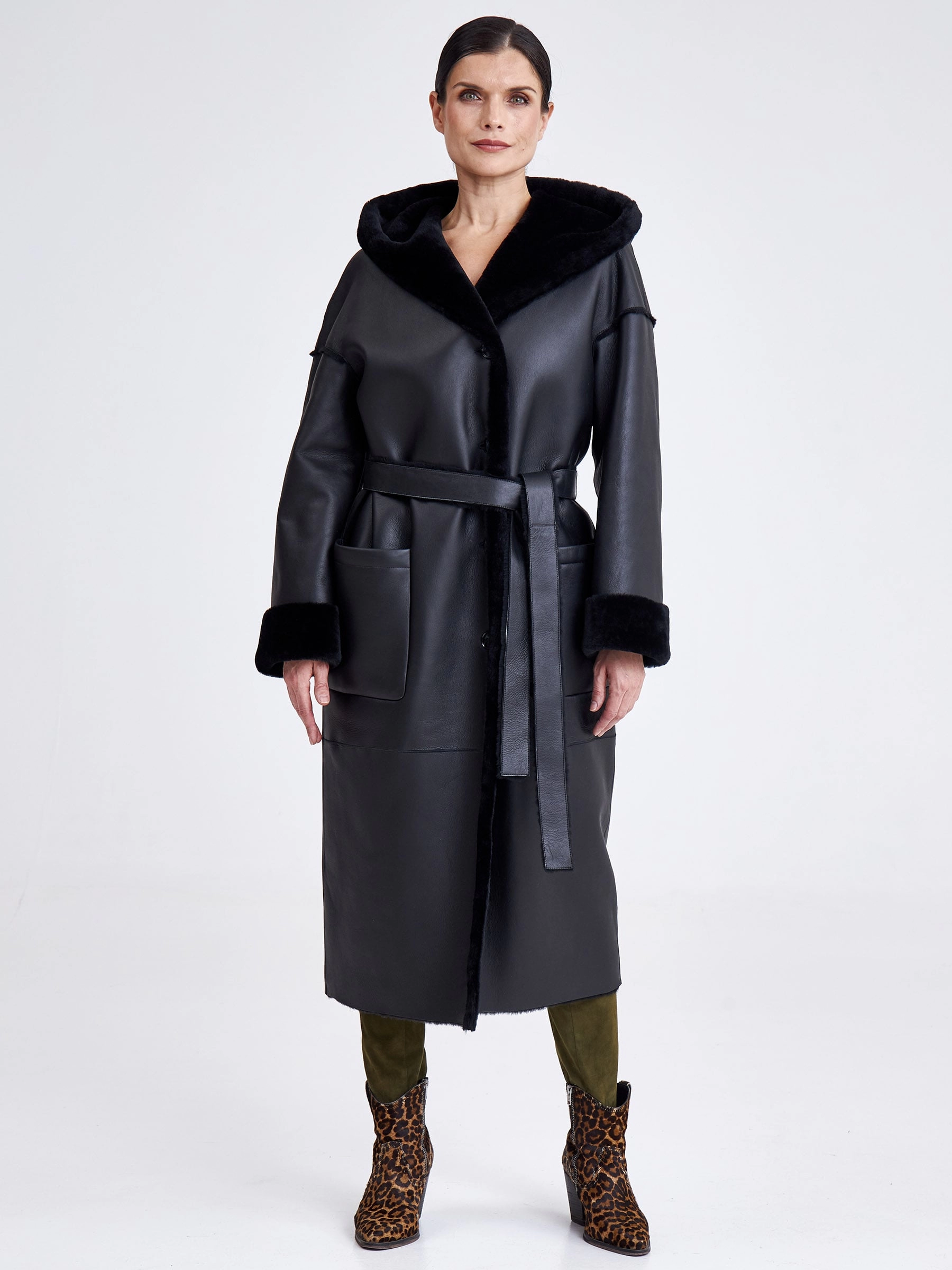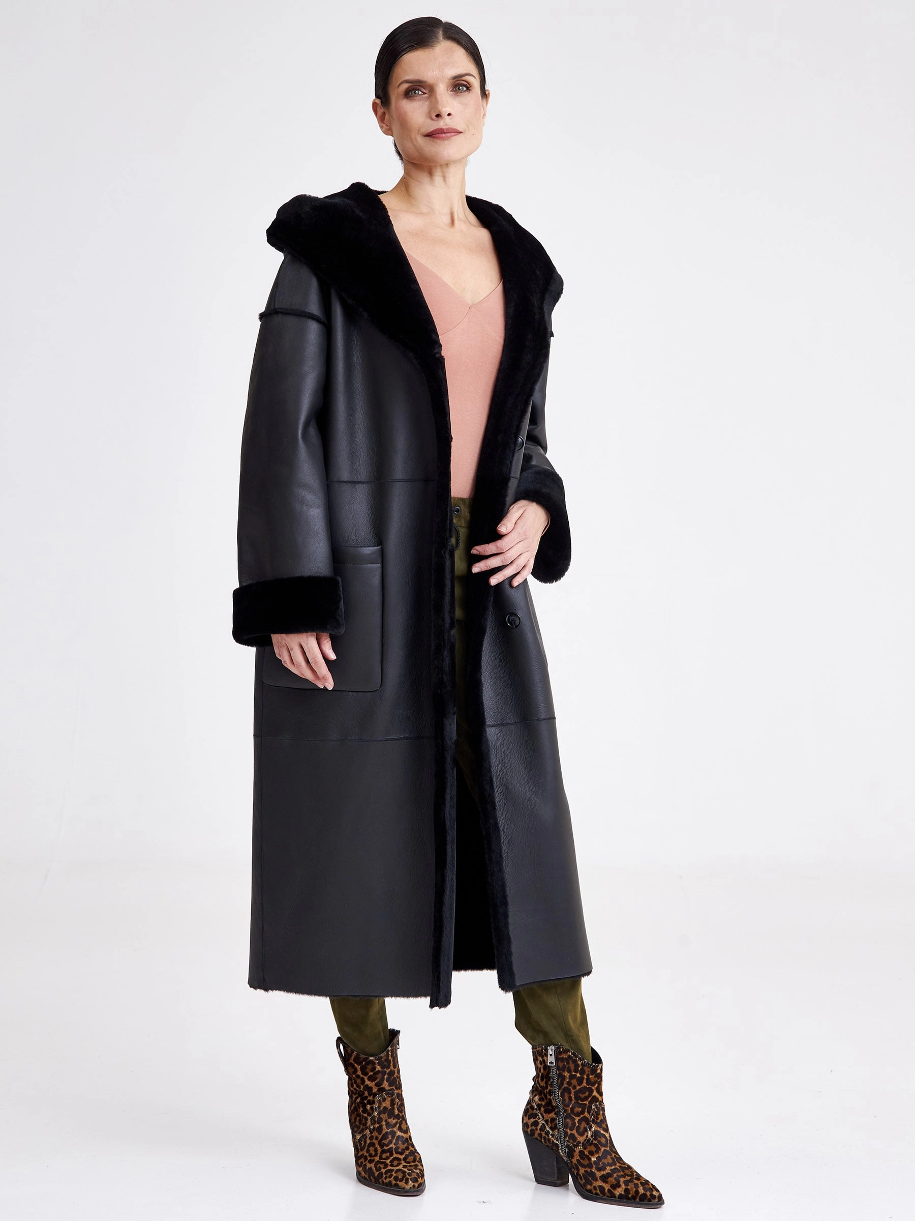 Товар женское пальто оверсайз из натуральной овчины с капюшоном премиум класса 2008, черное, размер 44, артикул 63710 выполнен из овчина "мерино" с застежкой пуговицы. Рассчитан на сезон: осень-зима. Длина изделия свыше 90 см, силуэт прямой.
