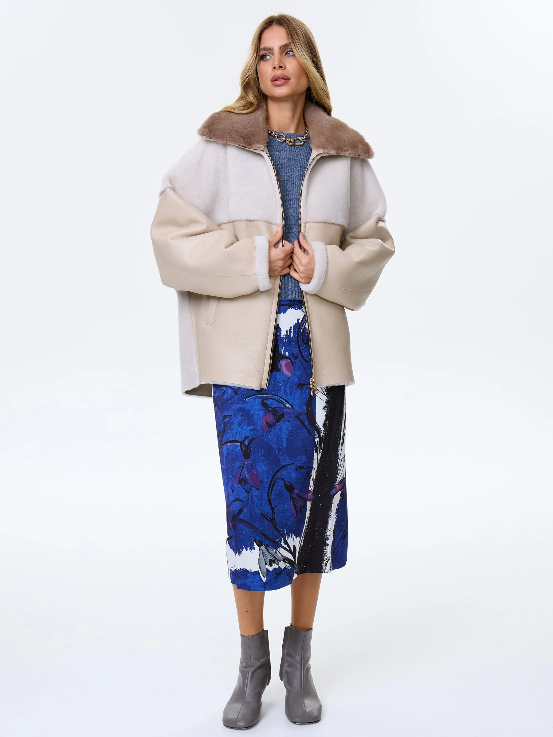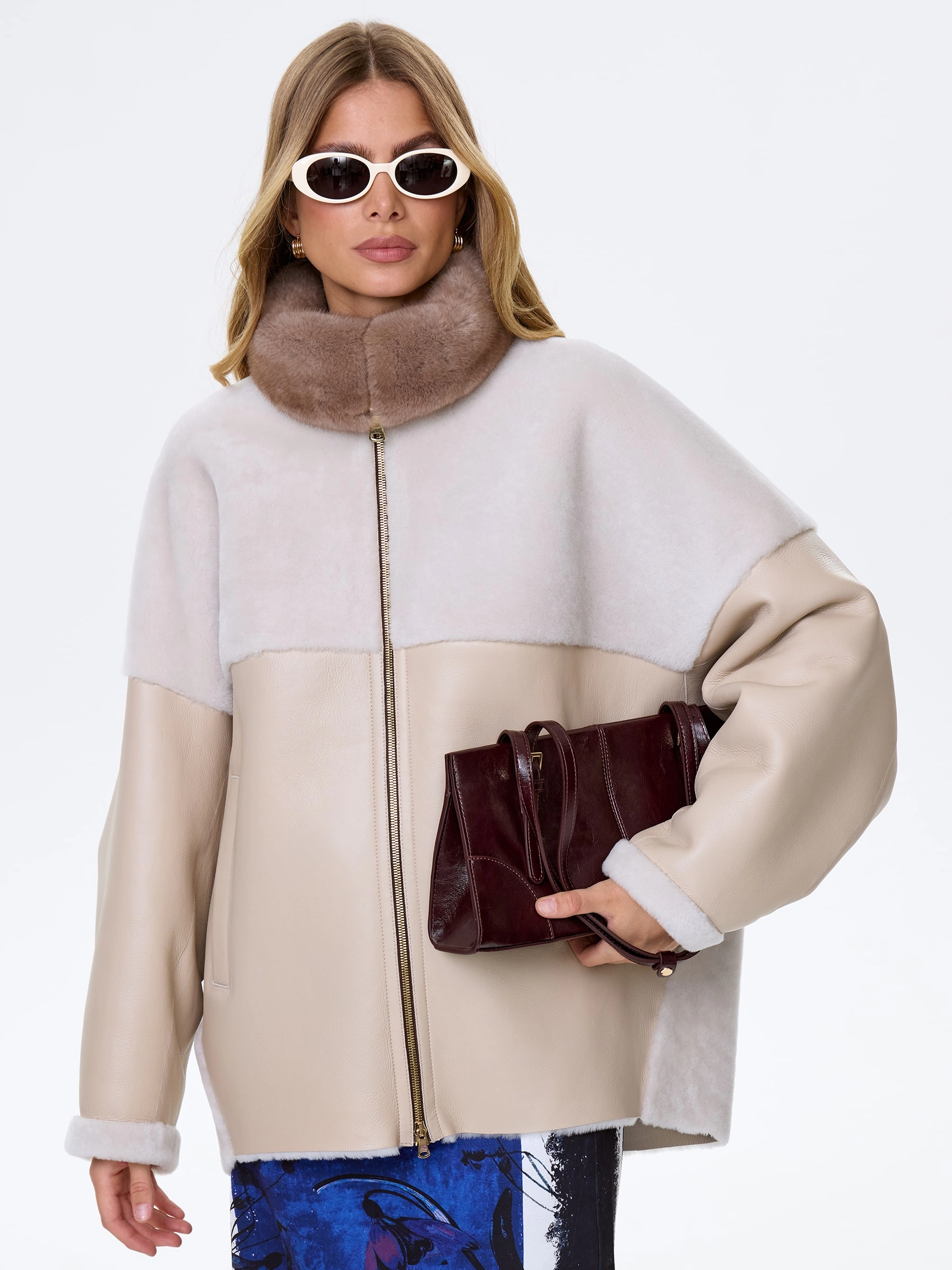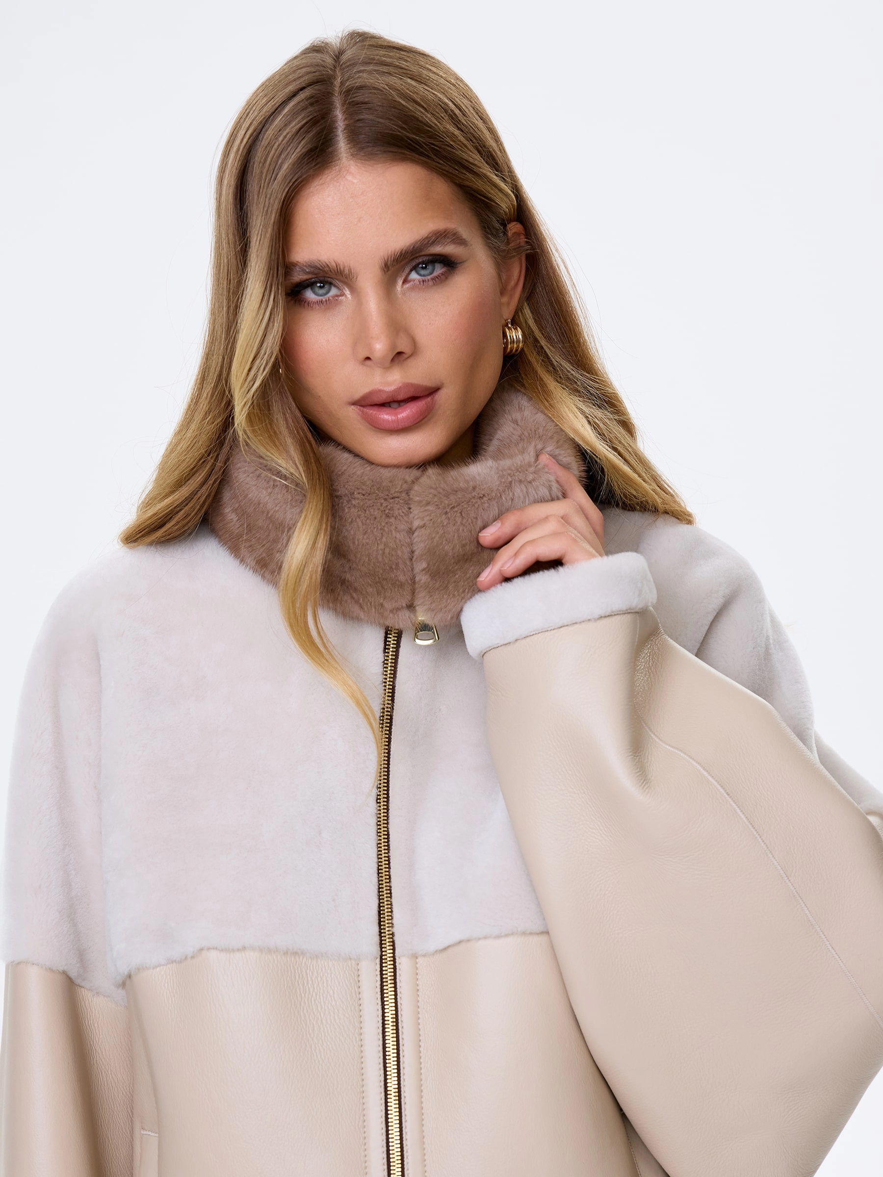 Стильное полупальто выполнили из натуральной овчины в сочетании с гладкой поверхностью.Свободный крой изделия не ограничивает движения. Высокий воротник-стойка отделанный густой норкой легко трансформируется в отложной. Удобные боковые карманы. Легкое, но теплое полупальто застегивется крупной молнией.