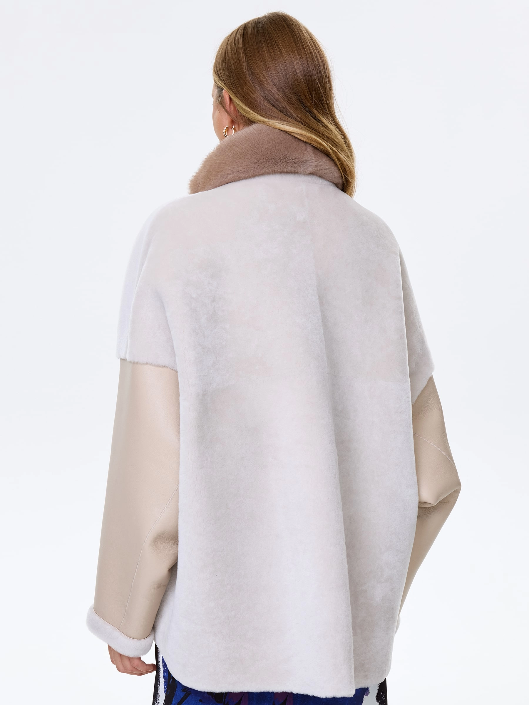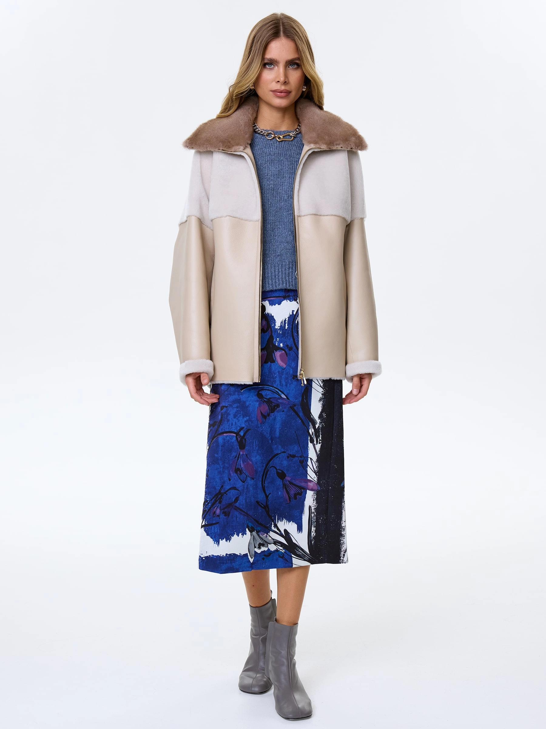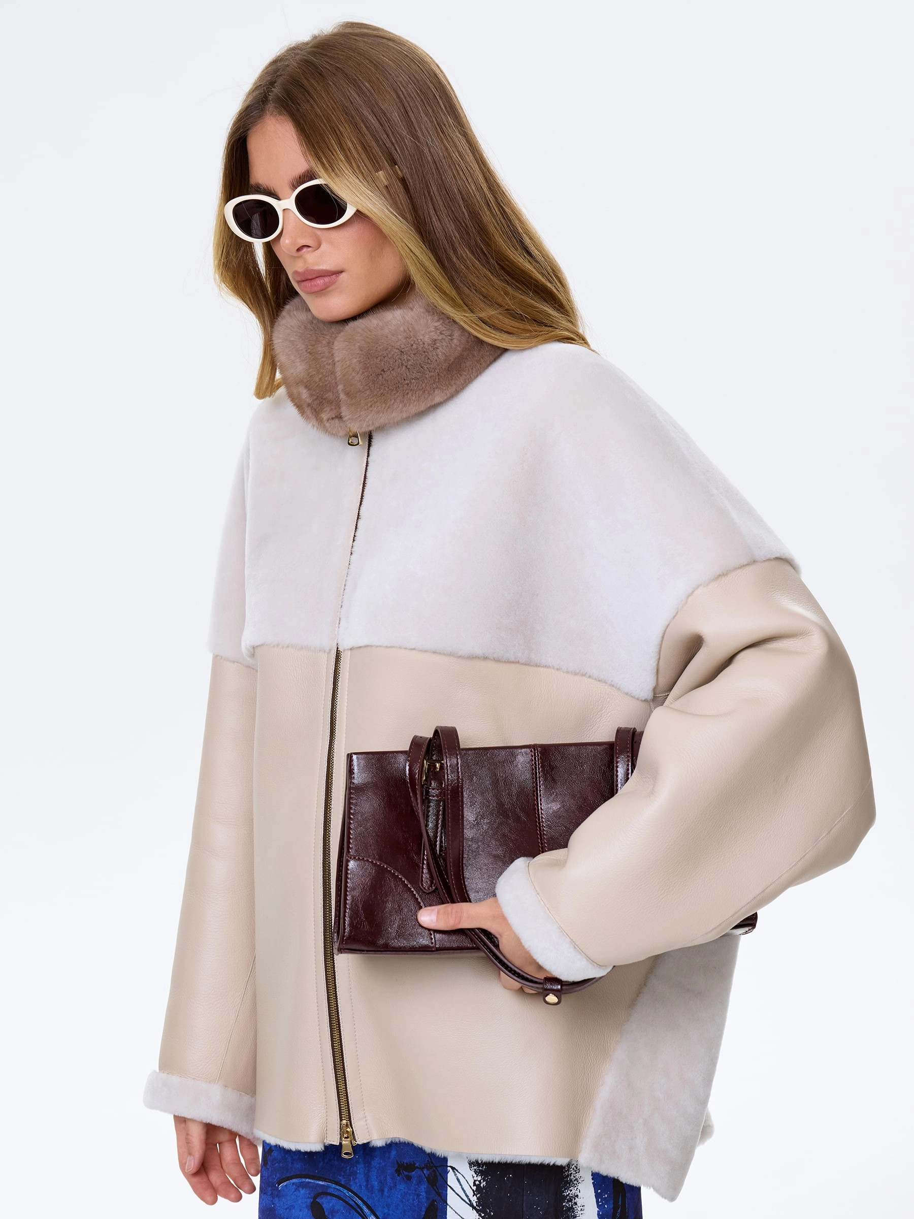 Стильное полупальто выполнили из натуральной овчины в сочетании с гладкой поверхностью.Свободный крой изделия не ограничивает движения. Высокий воротник-стойка отделанный густой норкой легко трансформируется в отложной. Удобные боковые карманы. Легкое, но теплое полупальто застегивется крупной молнией.