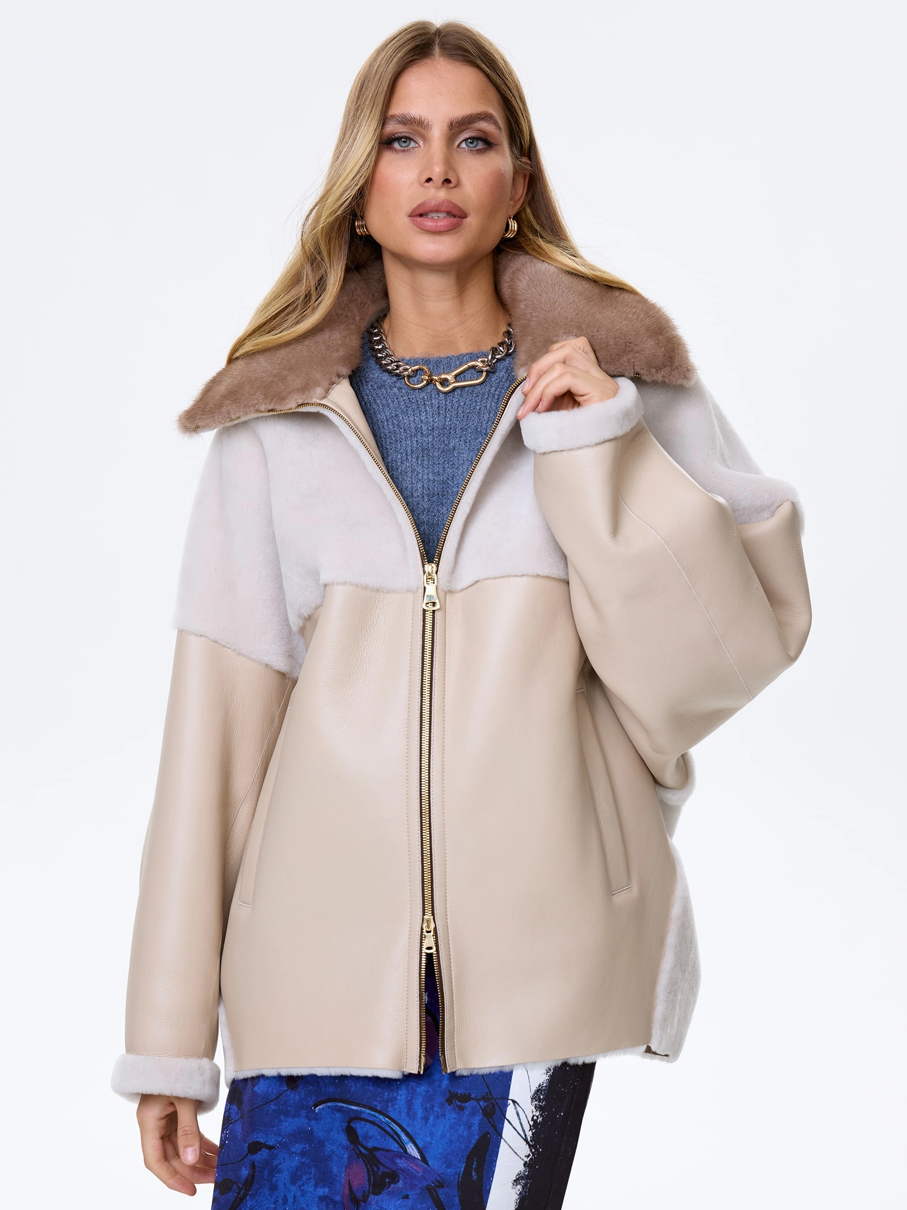 Товар женское полупальто из натуральной овчины с норковым воротником премиум класса 2034, бежевое, размер 52, артикул 64400 выполнен из овчина "мерино" с застежкой молния. Рассчитан на сезон: осень-зима. Длина изделия 76 см, силуэт свободный.