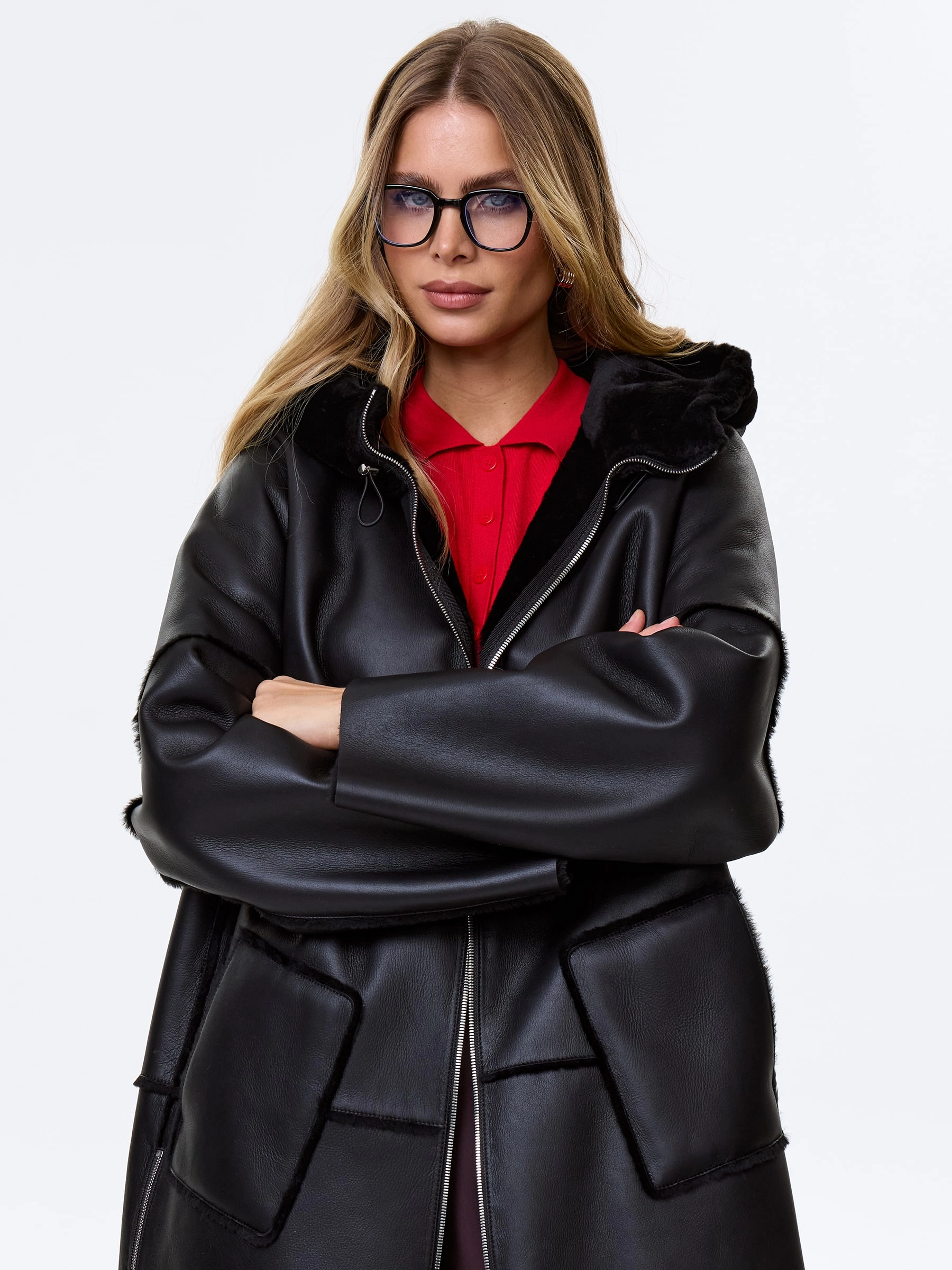 Товар женское полупальто с капюшоном из натуральной овчины премиум класса 2052, черное, размер 46, артикул 64290 выполнен из овчина "мерино" с застежкой молния. Рассчитан на сезон: осень-зима. Длина изделия 105 см, силуэт свободный.