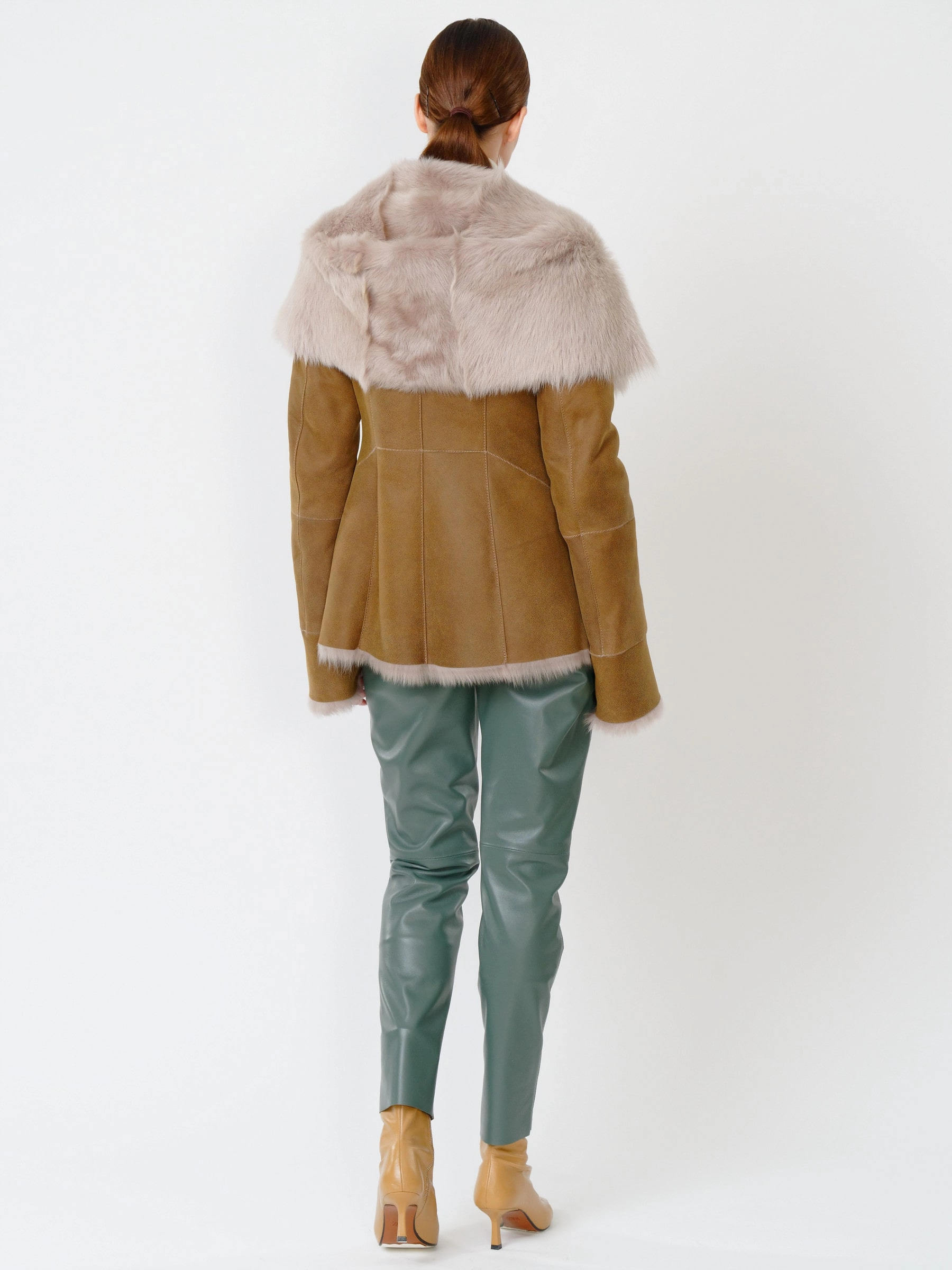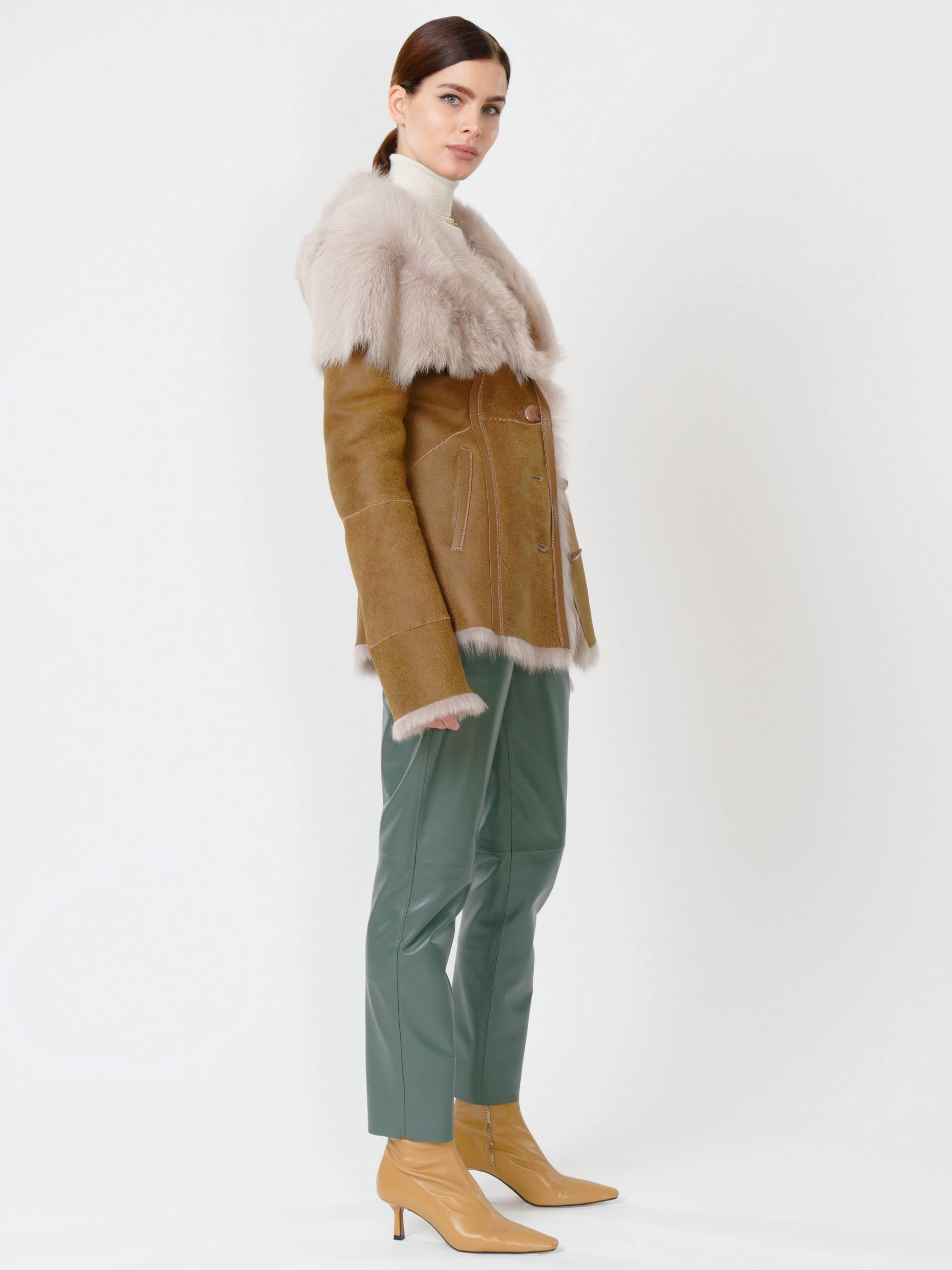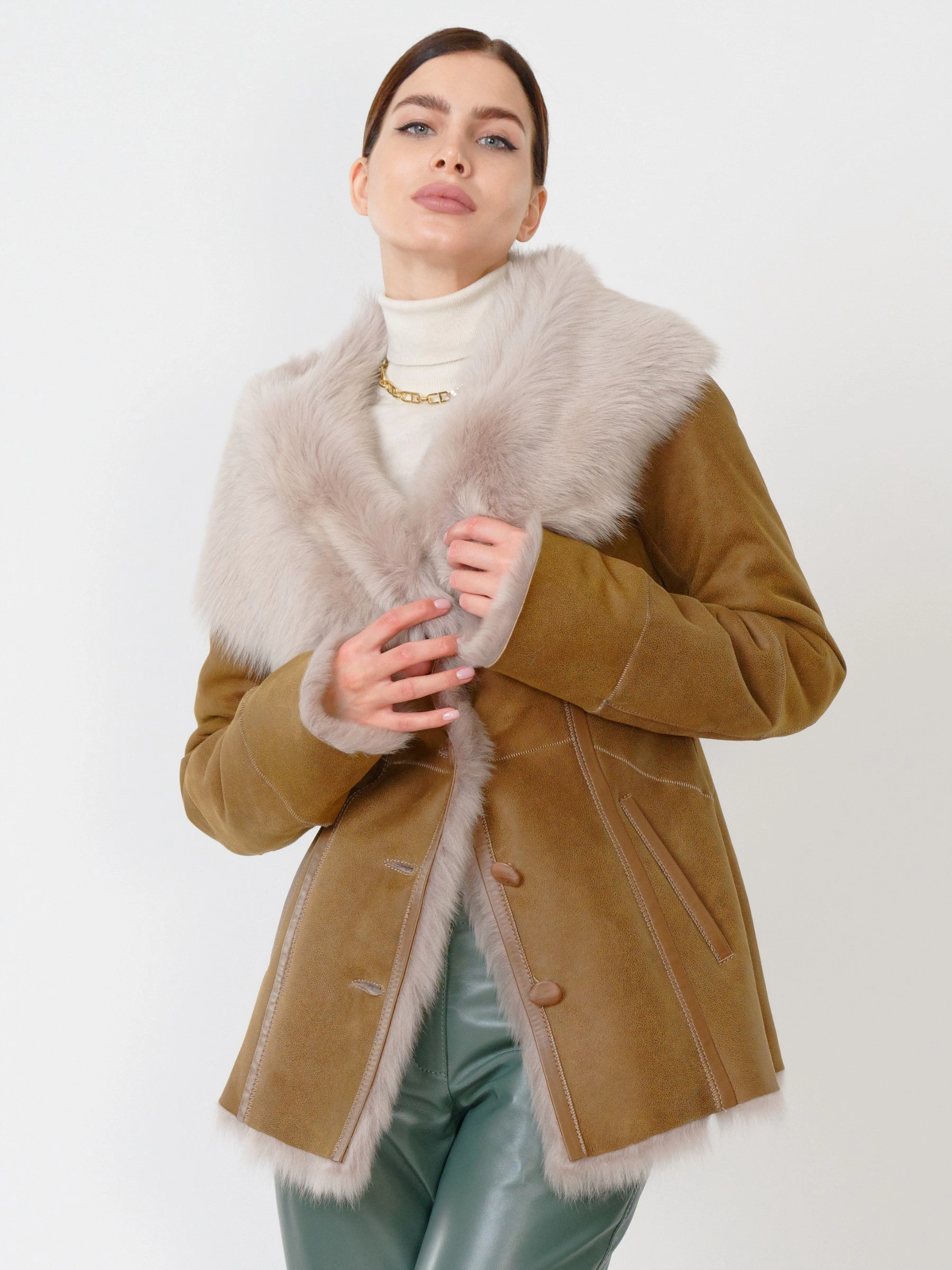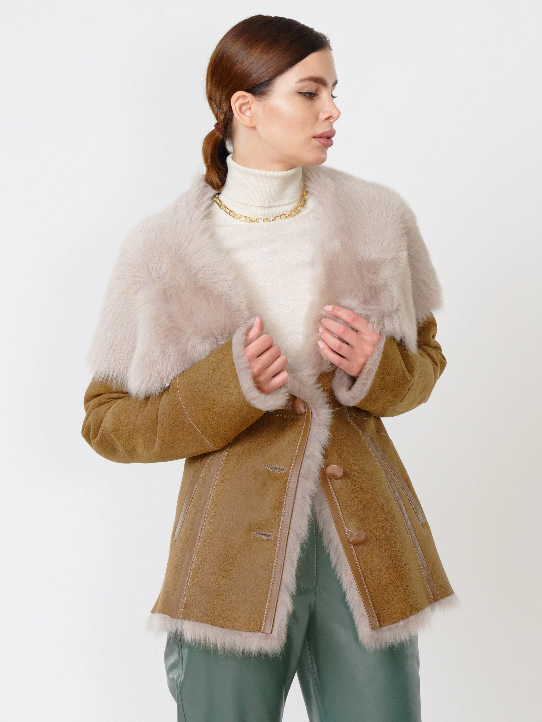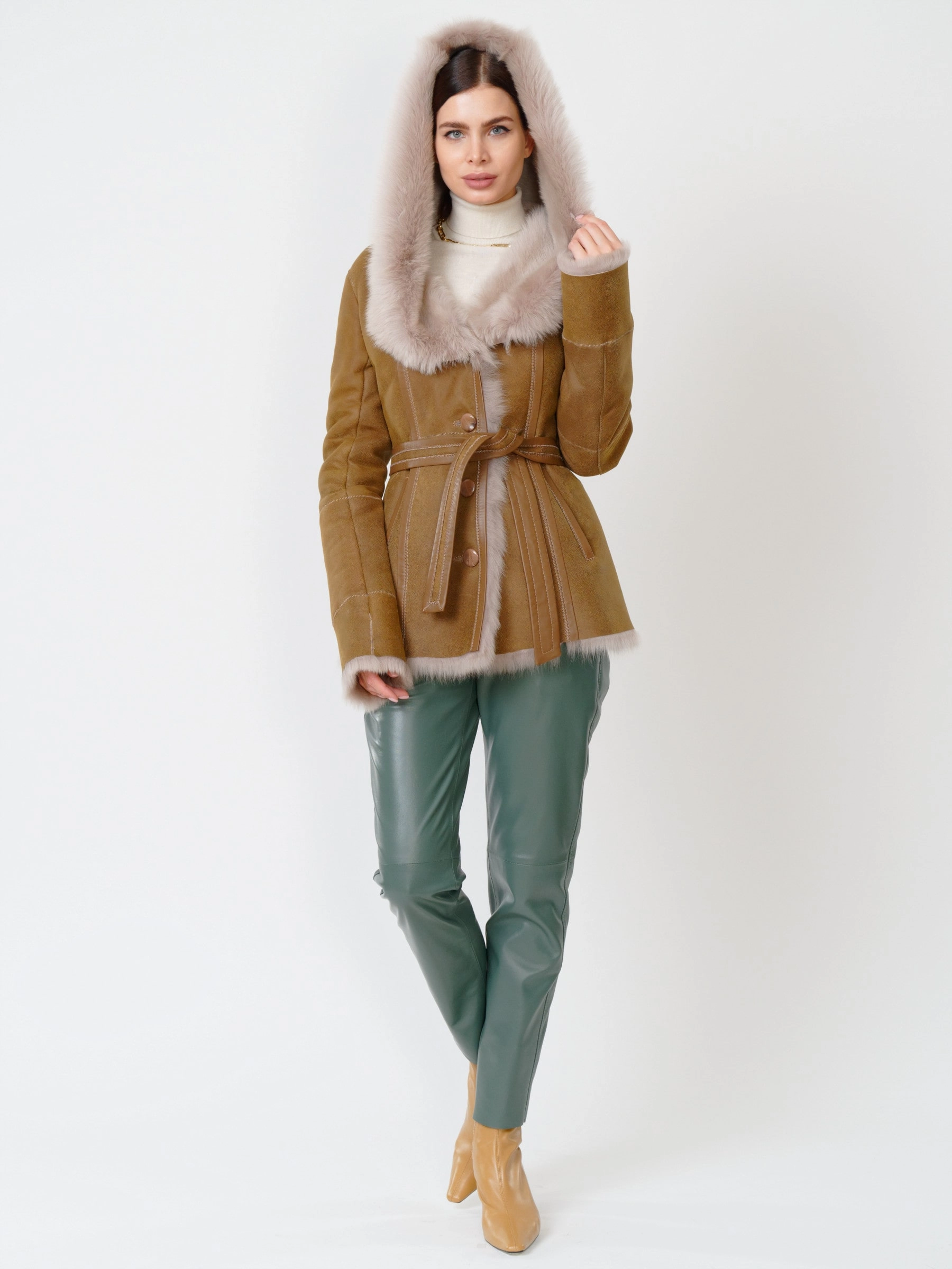 Зимний комплект женский: Дубленка 122 + Брюки 03, бежевый/оливковый, р. 42, арт. 111367