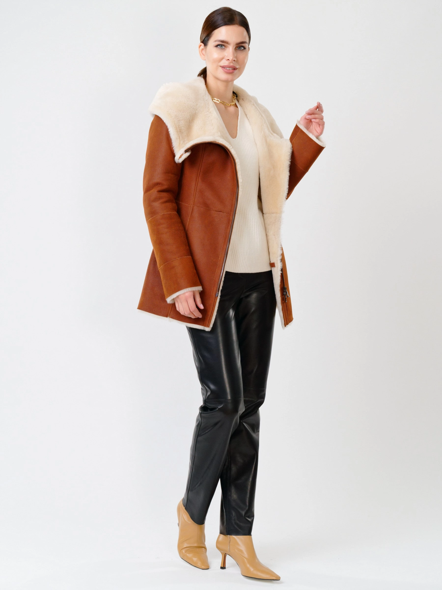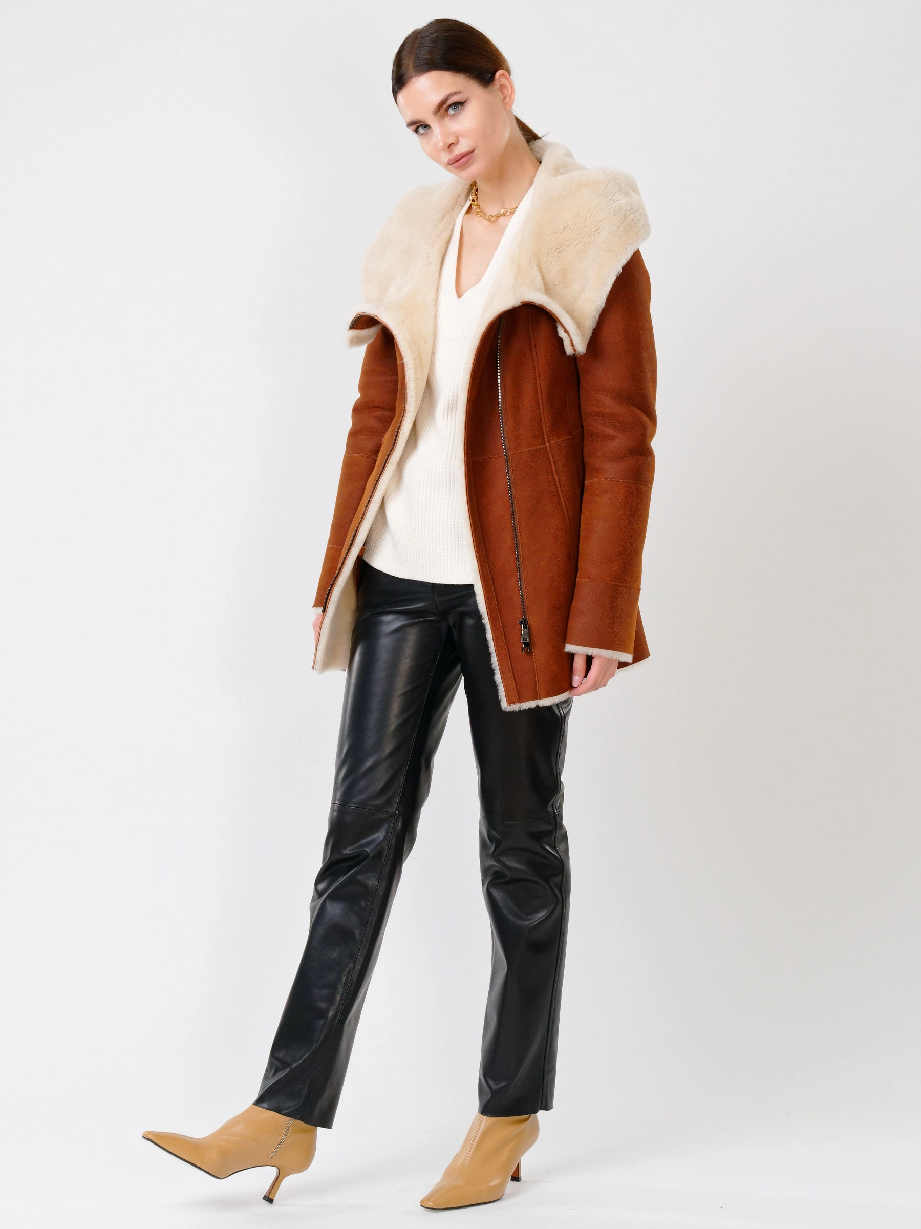 Простые базовые вещи: дубленка из овчины мерино в сочетании с кожаными брюками широкого кроя. Превосходно смотрятся в одном образе. Всегда модно и стильно. Абсолютный комфорт.