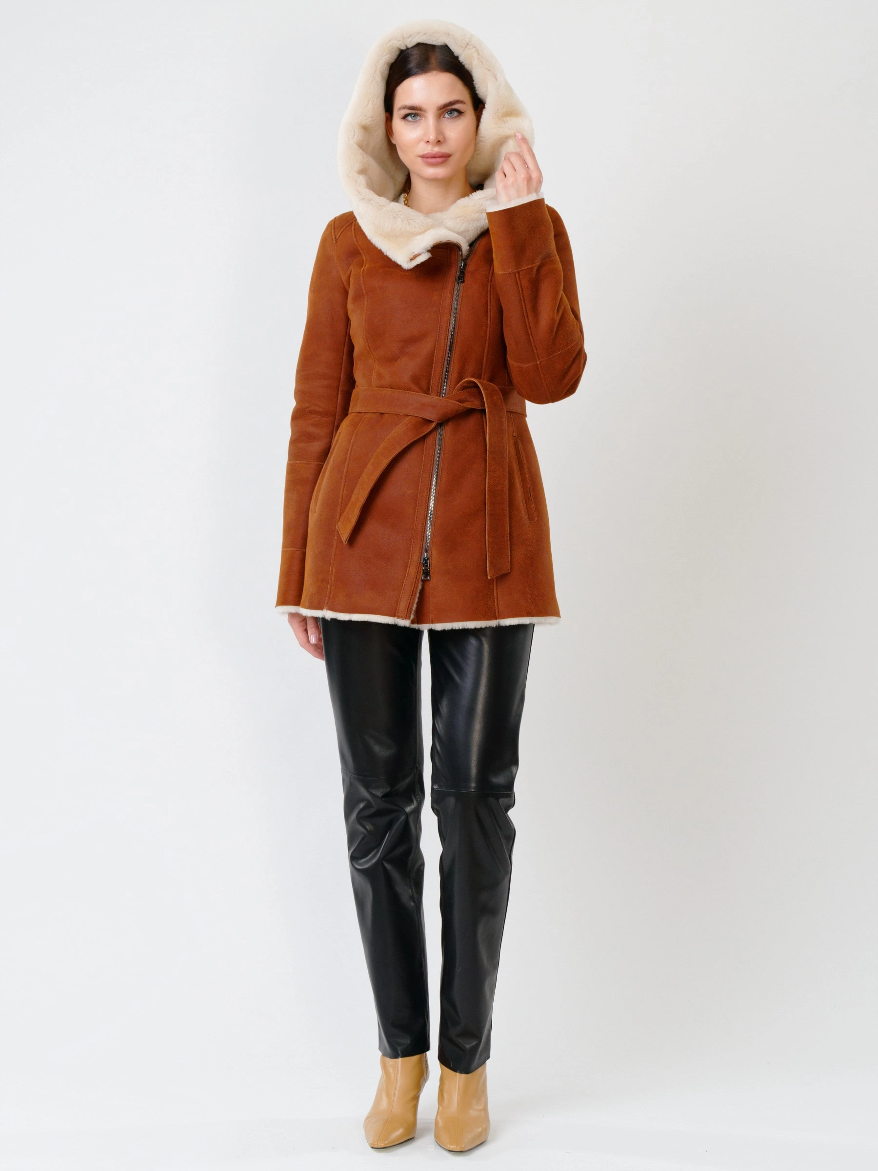 Зимний комплект женский: Дубленка 200 + Брюки 03, табачный/черный, р. 44, арт. 111377