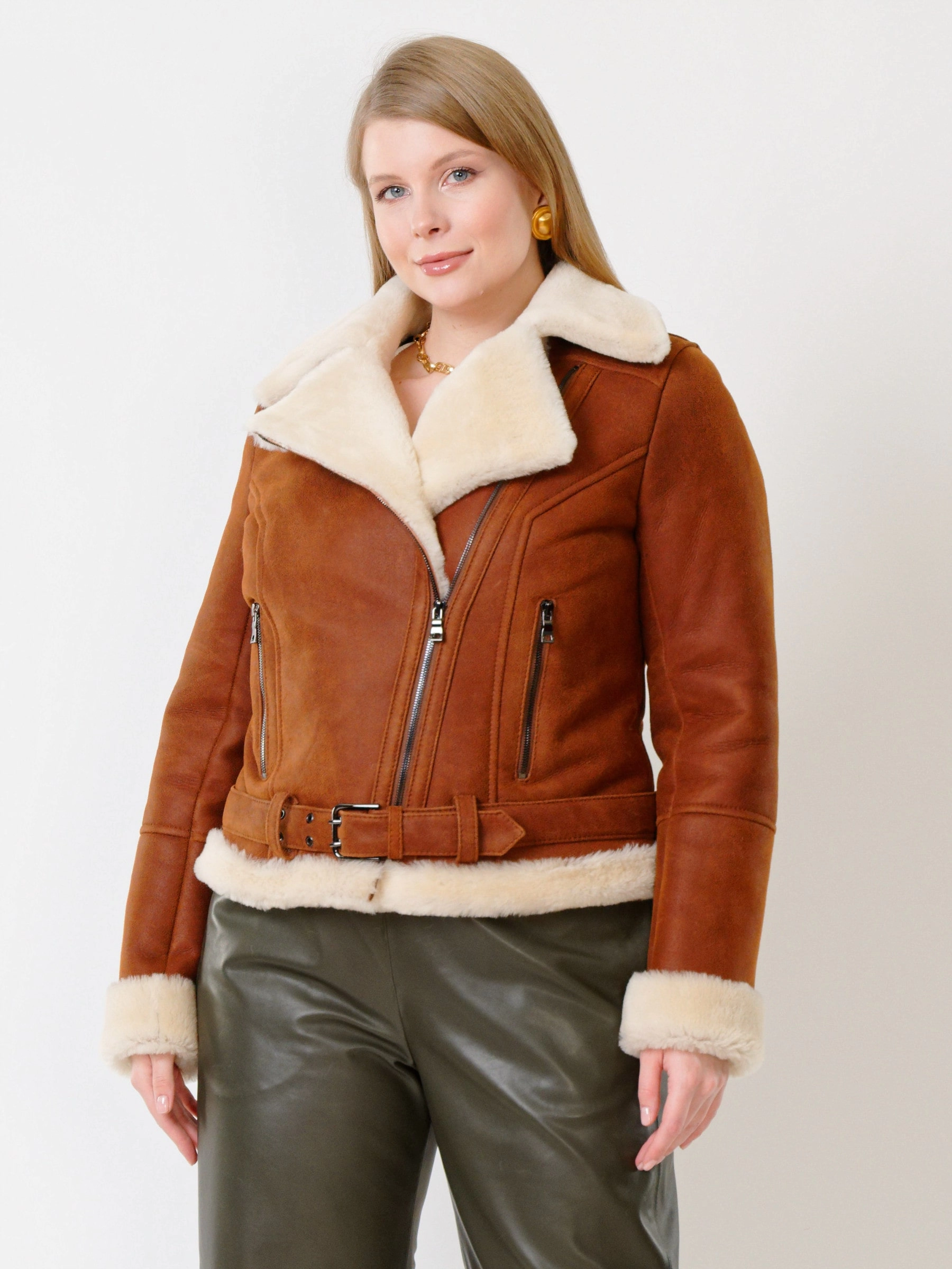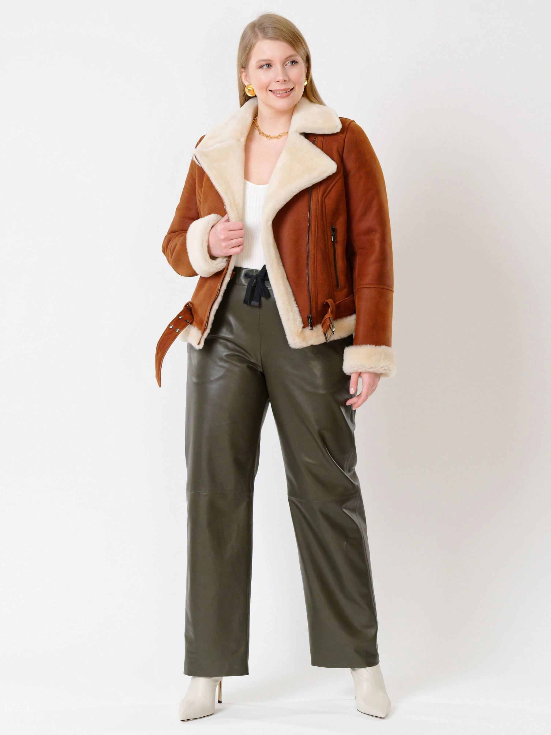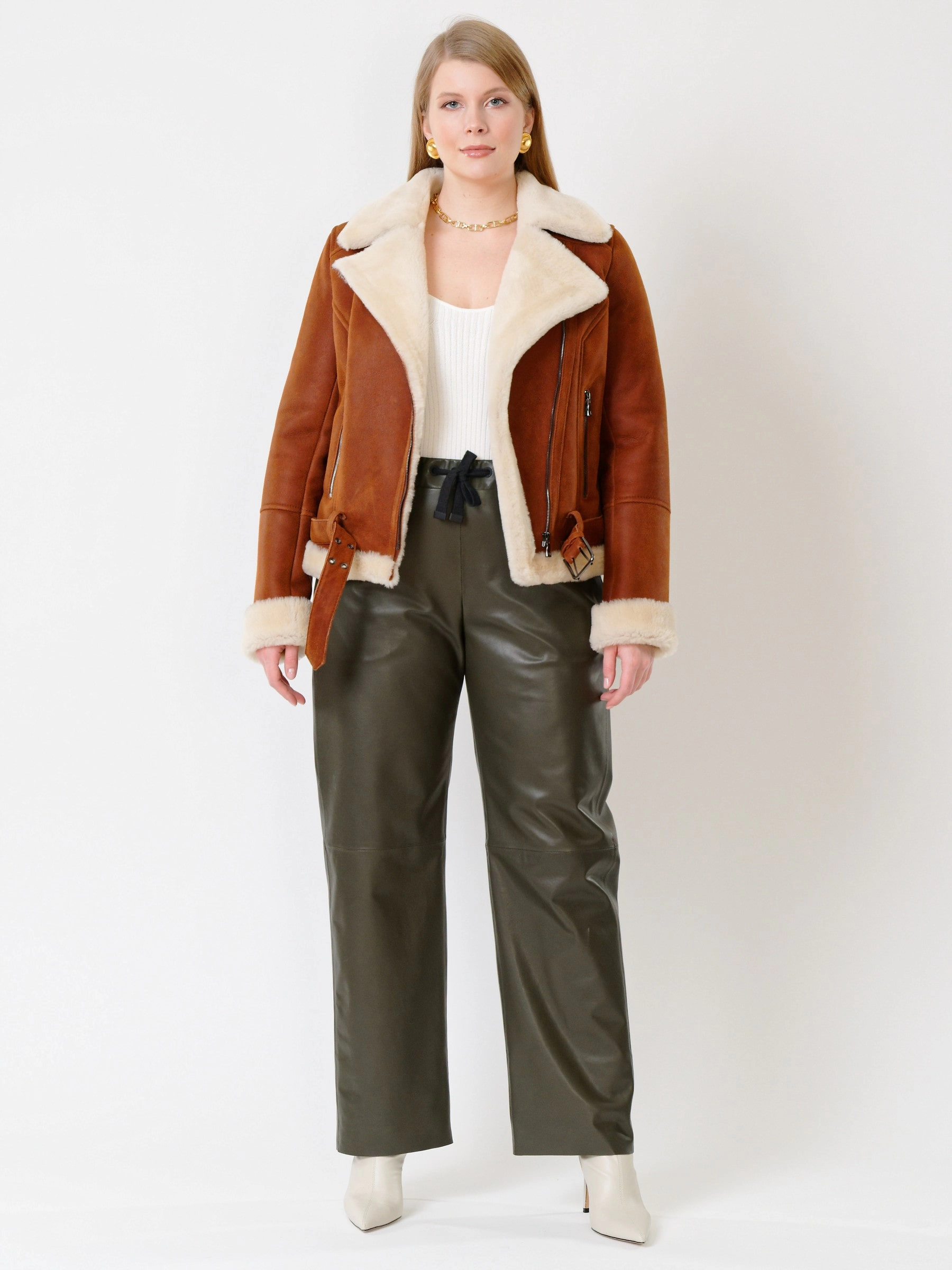 Зимний комплект женский: Дубленка 201 + Брюки 06, табачный/оливковый, р. 48, арт. 111353