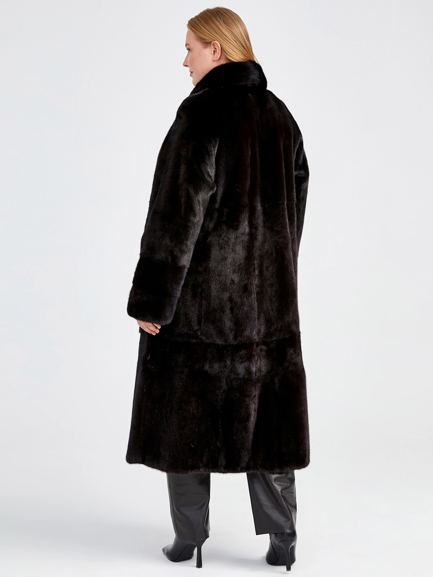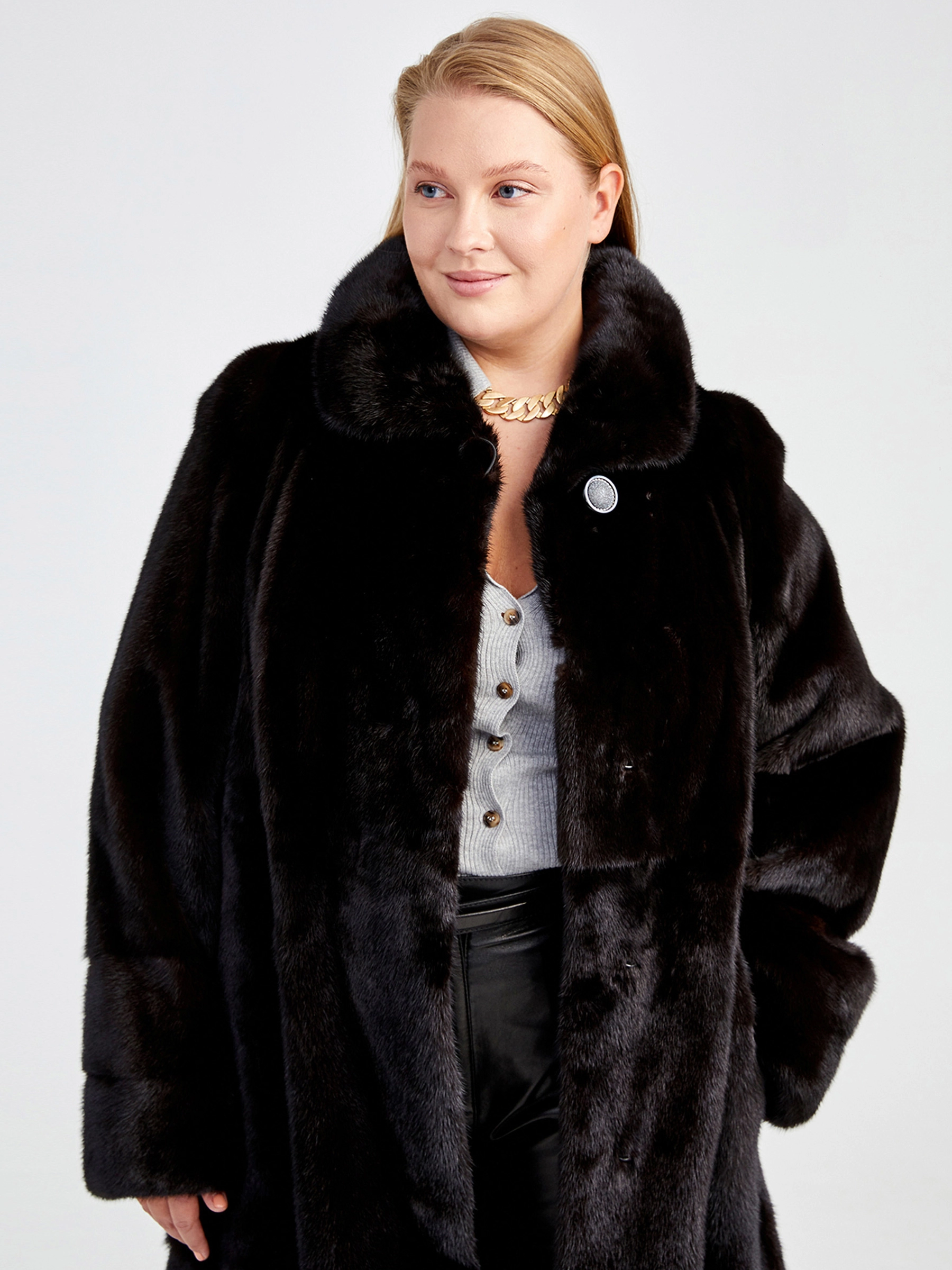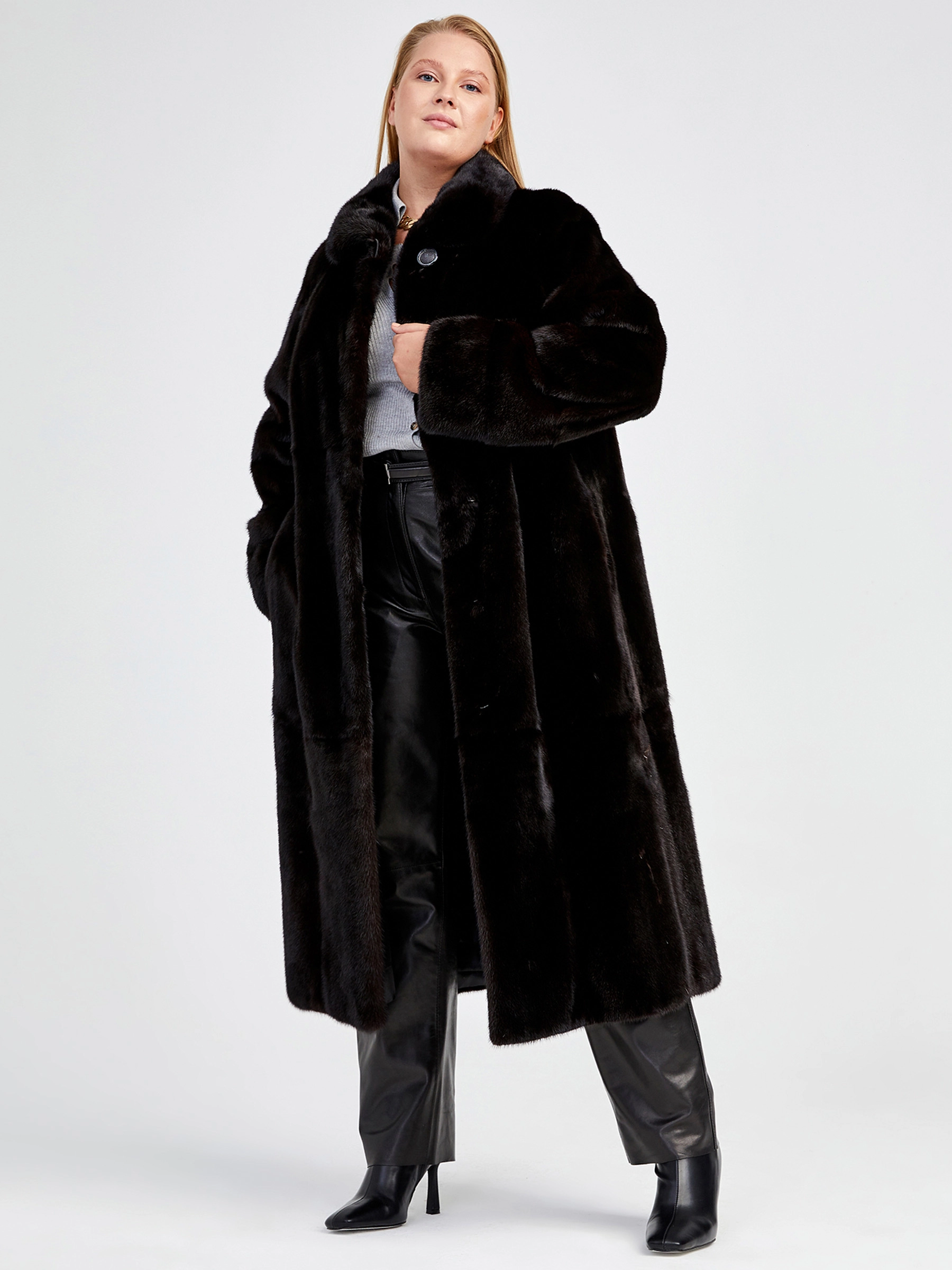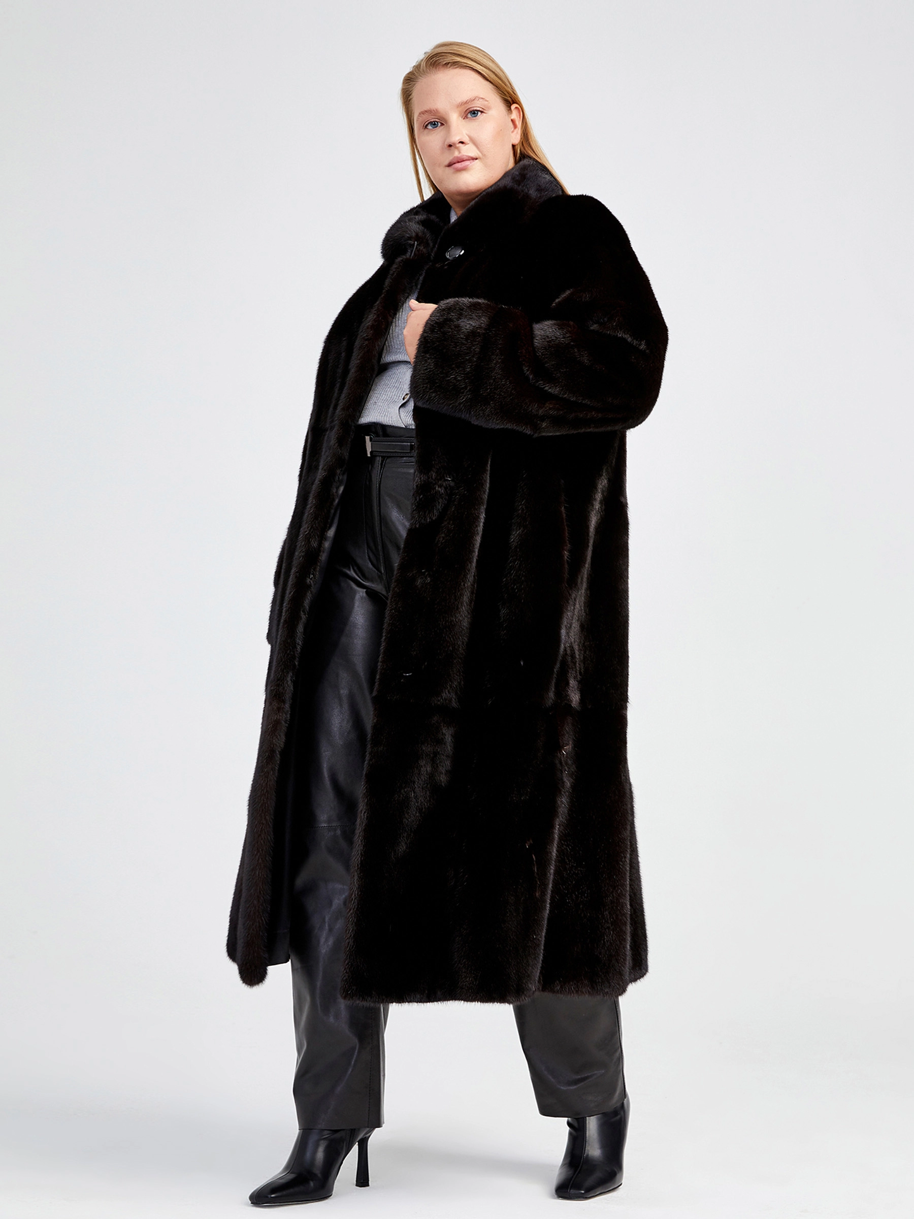 Этот стиль подходит женщинам, которые ценят классику, комфорт и качество. Великолепная скандинавская норка, силуэт-трапеция. Теплая и уютная шубка справится с любым русским морозом. Великолепным сочетанием станут кожаные брюки свободного кроя.